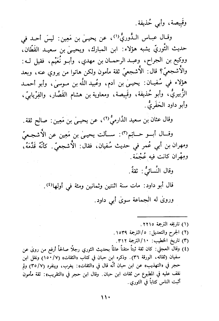 وَقَال عَباس الدُّورِيُّ (1) ، عَنْ يحيى بْن مَعِين: لَيْسَ أحد فِي حَدِيث الثَّوْرِي يشبه هؤلاء: ابن المبارك، ويَحْيَى بْن سَعِيد الْقَطَّان، ووكيع بْن الجراح، وعَبْد الرَّحْمَنِ بْن مهدي، وأَبُو نعيم، فقيل لَهُ: والأشجعي؟ قال: الأشجعي ثقة مأمون ولكن هاتوا من يَرْوِي عَنْهُ، وبعد هَؤُلاءِ فِي سُفْيَان: يَحْيَى بْن آدم، وعُبَيد اللَّه بن موسى، وأبو أحمد الزبيري، وأَبُو حذيفة، وقبيصة، ومعاوية بْن هِشَام القصار، والفريابي، وأَبُو دَاوُد الحفري.