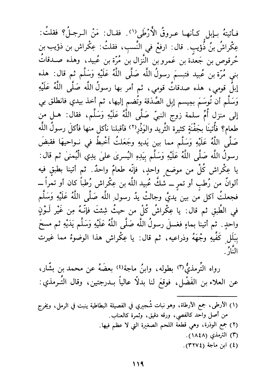 قال: ارْفَعْ فِي النَّسَبِ، فَقُلْتُ: عِكْرَاشُ بْنُ ذُؤَيْبِ بن حوقوص بن جعدة بن عَمْرو بن النزال بْن مرة بْن عُبَيد، وهَذِهِ صَدَقَاتُ بَنِي مُرَّةَ بْنِ عُبَيد فَتَبَسَّمَ رَسُولُ اللَّهِ صلى اللَّهُ عَلَيْهِ وسَلَّمَ ثُمَّ قال: هذه إبل قومي، هذه صَدَقَاتُ قَوْمِي، ثُمَّ أَمَرَ بِهَا رَسُول اللَّهِ صلى الله عليه وسلم أَنْ تُوسَمَ بِمَيْسَمِ إِبِلِ الصَّدَقَةِ وتُضَمُّ إِلَيْهَا، ثُمَّ أَخَذَ بِيَدِي فَانْطَلَقَ بِي إِلَى مَنْزِلِ أم سلمة زوج النَّبِيّ صَلَّى الله عليه وسلم، فَقَالَ: هَلْ مِنْ طَعَامٍ؟ فَأُتِينَا بِجَفْنَةٍ كَثِيرَةِ الثَّرَيِدِ والْوَذْرِ (2) فَأَقْبَلْنَا نَأْكُلُ مِنْهَا فَأَكَلَ رَسُولُ اللَّهِ صلى الله عليه وسلم مِمَّا بَيْنَ يَدَيْهِ وجَعَلْتُ أَخْبَطَ فِي نَوَاحِيهَا فَقَبَضَ رَسُول اللَّهِ صلى الله عليه وسلم بِيَدِهِ الْيُسْرَى عَلَى يَدِي الْيُمْنَى ثُمَّ قال: يَا عِكْرَاشُ كُلْ مِنْ مَوْضِعٍ واحِدٍ، فَإِنَّهُ طَعَامٌ واحِدٌ، ثُمَّ أَتَيْنَا بِطَبَقٍ فِيهِ أَلْوَانٌ مِنْ رُطَبٍ أَوْ تَمْرٍ - شَكَّ عُبَيد اللَّهِ بْنُ عِكْرَاشٍ رُطَبَّا كَانَ أَوْ تَمْرًا - فجعلت آكل من يَدِي وجَالَتْ يَدُ رَسُولِ اللَّهِ صلى الله عليه وسلم فِي الطَّبَقِ ثُمَّ قال: يَا عِكْرَاشُ كُلْ مِنْ حَيْثُ شِئْتَ فَإِنَّهُ مِنْ غَيْرِ لَوْنٍ واحِدٍ. ثُمَّ أَتَيْنَا بِمَاءٍ فَغَسَلَ رَسُولُ اللَّهِ صلى الله عليه وسلم يَدَيْهِ ثم مسح ببلل كفيه وجهه وذِرَاعَيْهِ، ثُمَّ قال: يَا عِكْرَاشُ هَذَا الوْضُوُءُ مِمَّا غَيَّرَتِ النَّارُ.