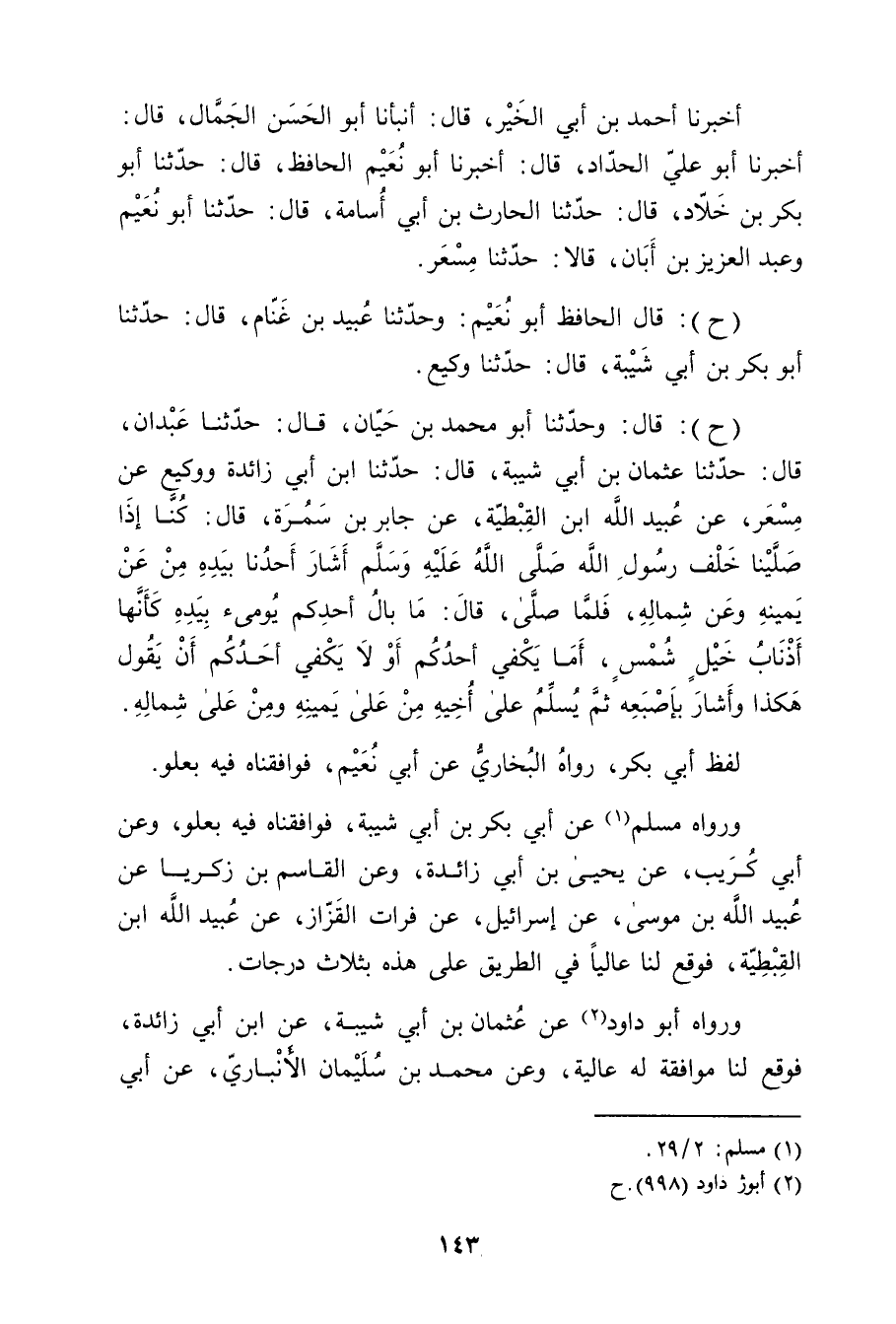 ورواه مسلم (1) عَن أَبِي بكر بْن أَبي شَيْبَة، فوافقناه فِيهِ بعلو، وعَن أَبِي كريب، عَنْ يَحْيَى بْن أَبي زائدة، وعَنِ الْقَاسِم بْن زَكَرِيَّا عَنْ عُبَيد اللَّهِ بْنُ مُوسَى، عَنْ إسرائيل، عَنْ فرات القزاز، عَنْ عُبَيد اللَّه بْن القبطية، فوقع لنا عاليا فِي الطريق عَلَى هذه بثلاث الدرجات.