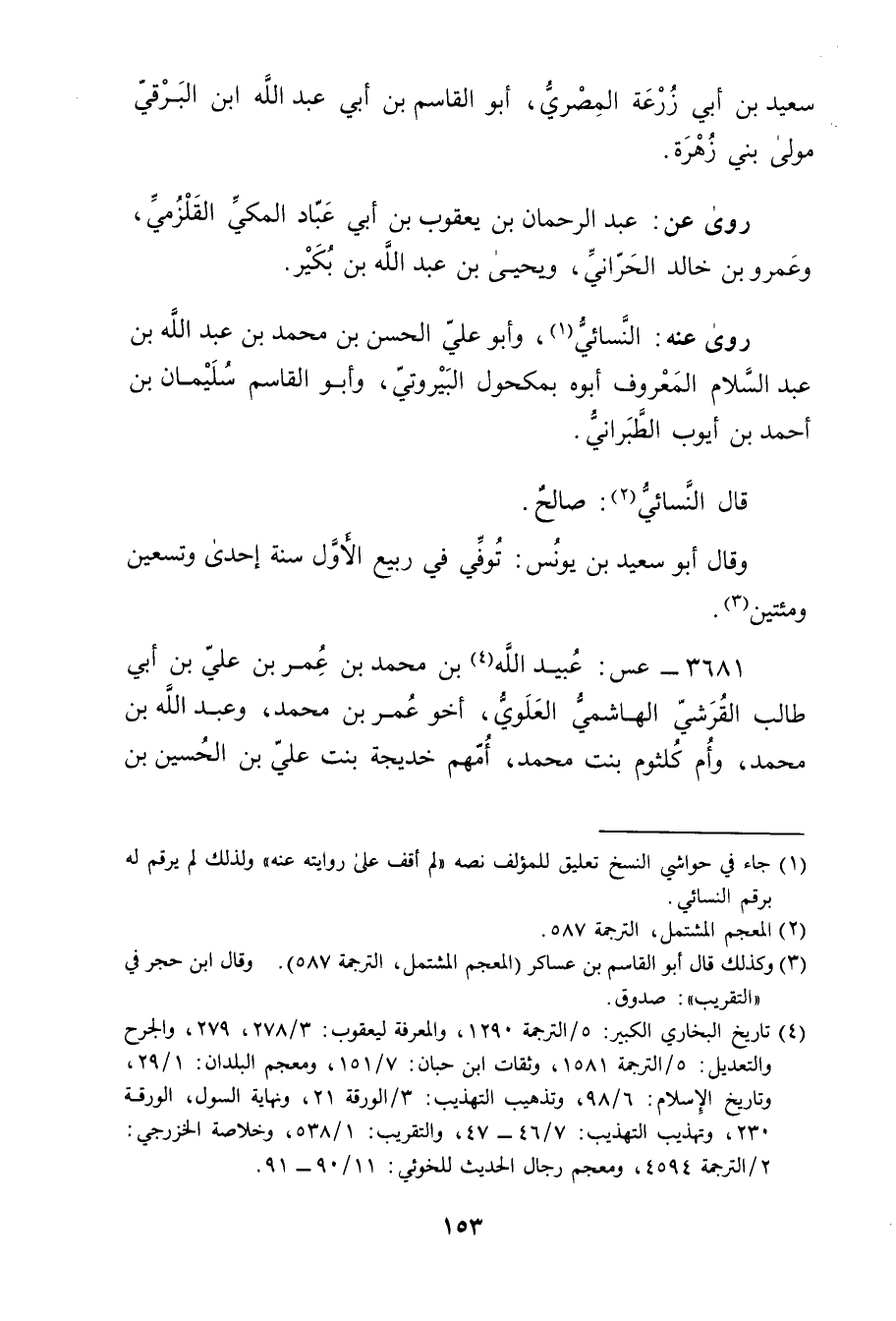 3681 - عس: عُبَيد اللَّه بن مُحَمَّد بْن عُمَر بْن علي بْن أَبي طالب القرشي الهاشمي العلوي (4) ، أَخُو عُمَر بْن مُحَمَّد، وعبد اللَّه بْن مُحَمَّد، وأم كلثوم بنت مُحَمَّد، أمهم خديجة بنت علي بن الحسين بْن