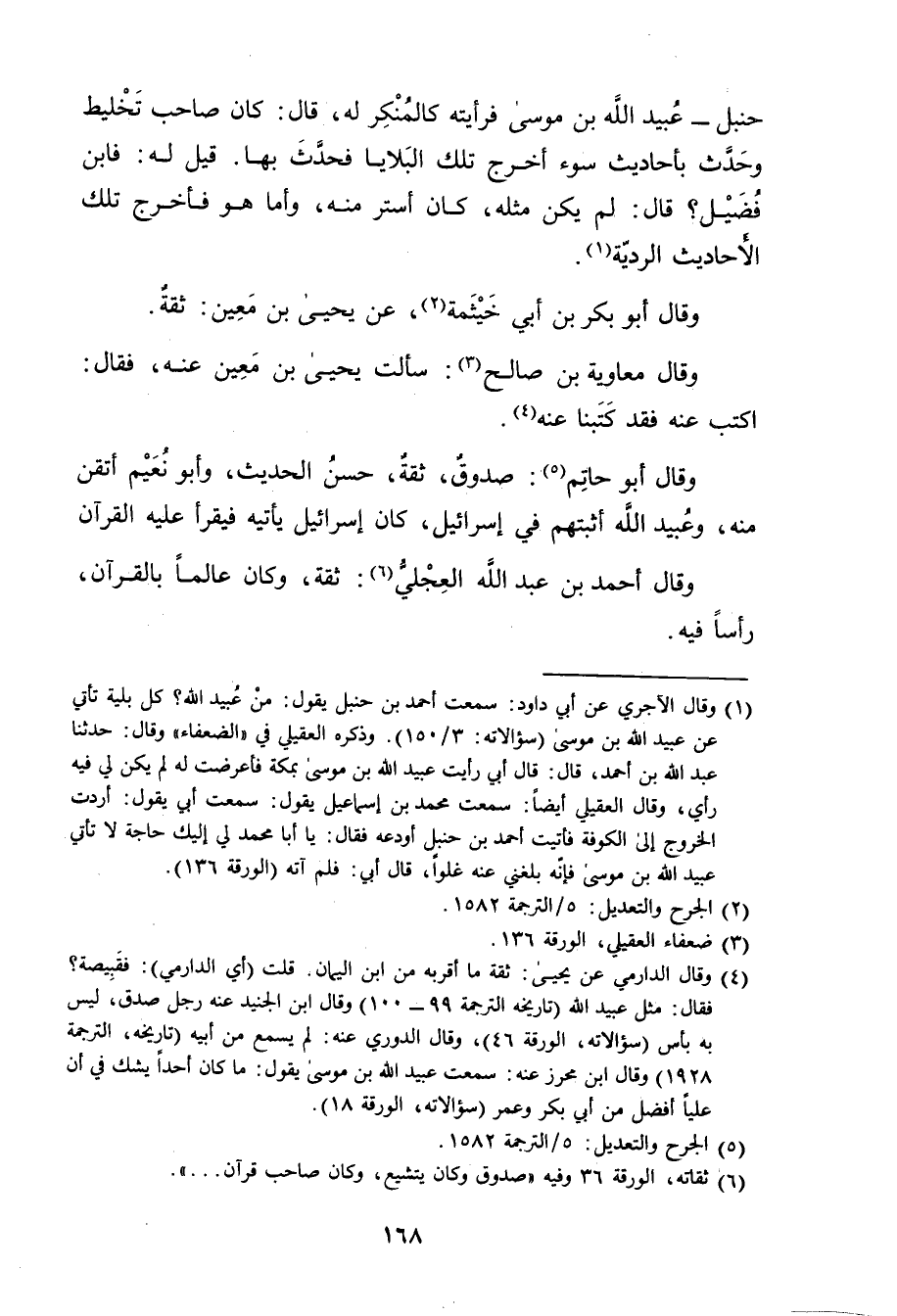 (4) وَقَال الدارمي عن يحيى: ثقة ما أقربه من ابن اليمان: قلت (أي الدارمي) : فقبيصة؟ فقال: مثل عُبَيد الله (تاريخه الترجمة 99 - 100) وَقَال ابن الجنيد عنه رجل صدق، ليس به بأس (سؤالاته، الورقة 46) ، وَقَال الدوري عَنه: لم يسمع من ابيه (تاريخه، الترجمة 1928) وَقَال ابن محرز عَنه: سمعت عُبَيد الله بن موسى يقول: ما كان أحدًا يشك في أن عليا أفضل من أبي بكر وعُمَر (سؤالاته، الورقة 18) .