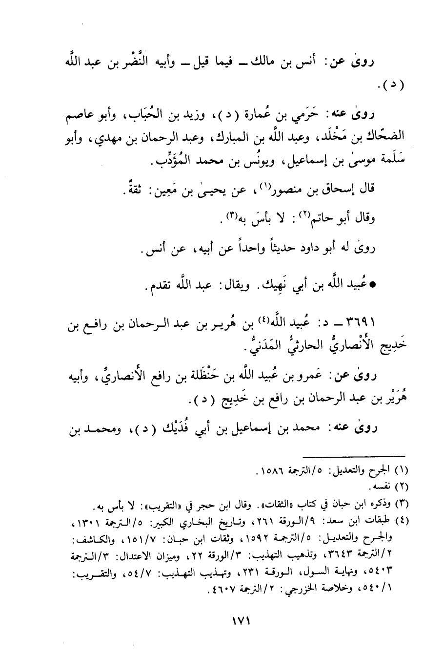(4) طبقات ابن سعد: 9 / الورقة 261، وتاريخ البخاري الكبير: 5 / الترجمة 1301، والجرح والتعديل: 5 / الترجمة 1592، وثقات ابن حبان: 7 / 151، والكاشف: 2 / الترجمة 3643، وتذهيب التهذيب: 3 / الورقة 22، وميزان الاعتدال: 3 / الترجمة 5403، ونهاية السول، الورقة 231، وتهذيب التهذيب: 7 / 54، والتقريب: 1 / 540، وخلاصة الخزرجي: 2 / الترجمة 4607.
