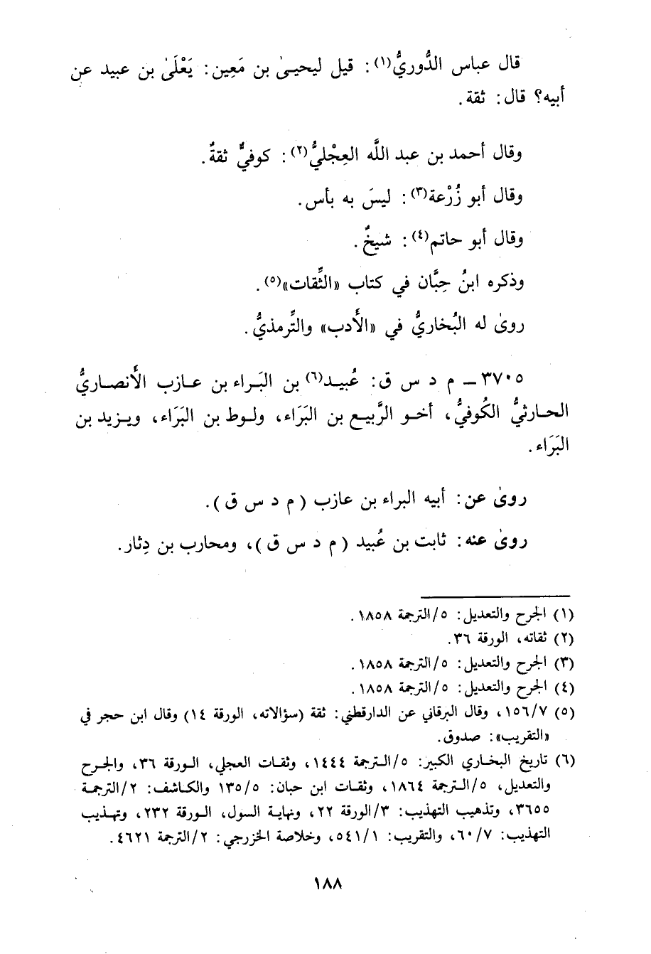 (6) تاريخ البخاري الكبير: 5 / الترجمة 1444، وثقات العجلي، الورقة 36، والجرح والتعديل، 5 / الترجمة 1864، وثقات ابن حبان: 5 / 135 والكاشف: 2 / الترجمة (3655) ، وتذهيب التهذيب: 3 / الورقة 22، ونهاية السول، الورقة 232، وتهذيب التهذيب: 7 / 60، والتقريب: 1 / 541، وخلاصة الخزرجي: 2 / الترجمة 4621.