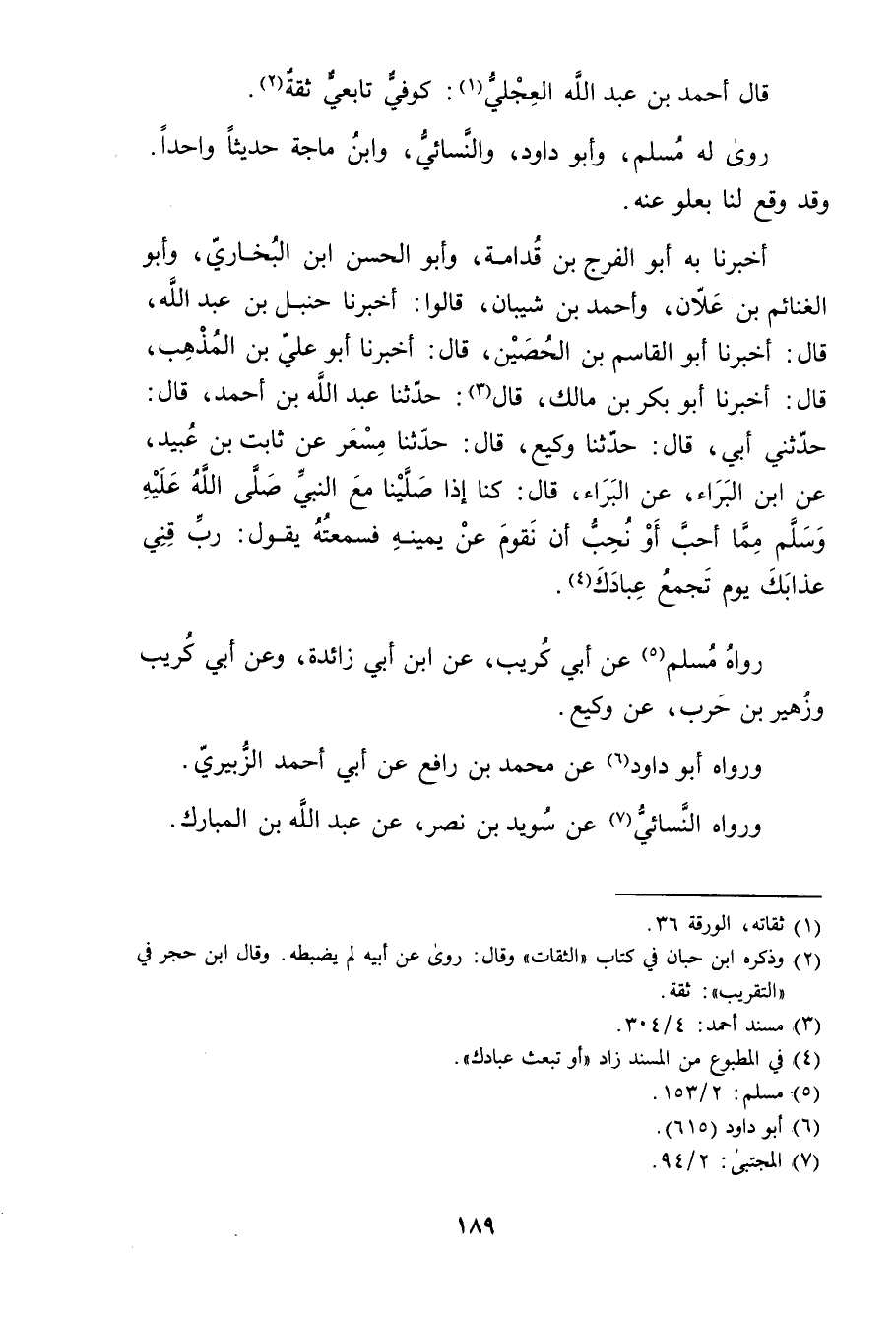 أَخْبَرَنَا بِهِ أَبُو الْفَرَجِ بْنُ قُدَامَةَ، وأَبُو الْحَسَنِ بْنُ الْبُخَارِيِّ، وأبو الغنائم بْن علان، وأحمد بن شيبان، قالو: أَخْبَرَنَا حنبل بْن عَبد الله، قال: أَخْبَرَنَا أبو القاسم بْن الحصين، قال: أَخْبَرَنَا أبو علي بْن المذهب، قال: أَخْبَرَنَا أبو بكر بْن مالك، قال: (3) : حَدَّثَنَا عَبد اللَّهِ بْن أَحْمَدَ، قال: حَدَّثني أبي، قال: حَدَّثَنَا وكيع، قال: حَدَّثَنَا مِسْعَرٌ عَنْ ثَابِتِ بْنِ عُبَيد، عَنِ ابْنِ الْبَرَاءِ، عَنِ الْبَرَاءِ، قال: كُنَّا إِذَا صَلَّيْنَا مَعَ النَّبِيِّ صلى الله عليه وسلم مِمَّا أَحَبَّ أَوْ نُحِبُّ أَنْ نَقُومَ عَنْ يَمِينِهِ فَسَمِعْتُهُ يَقُولُ: رَبِّ قِنِي عَذَابَكَ يَوْمَ تَجْمَعَ عِبَادَكَ (4) .
