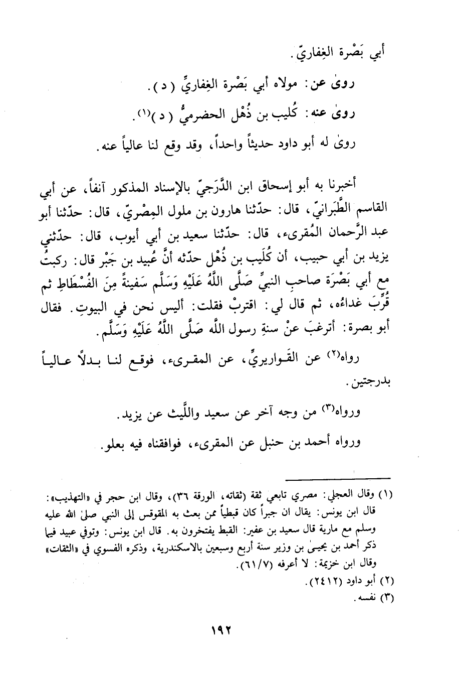 أَخْبَرَنَا بِهِ أبو إسحاق ابن الدَّرَجِيِّ بِالإِسْنَادِ الْمَذْكُورِ آنِفًا، عَن أَبِي الْقَاسِمِ الطَّبَرَانِيِّ، قال: حَدَّثَنَا هَارُونُ بْنُ مَلُّولٍ المِصْرِي، قال: حَدَّثَنَا أَبُو عَبْدِ الرَّحْمَنِ الْمُقْرِئُ، قال: حَدَّثَنَا سَعِيد بْنُ أَبي أَيُّوبَ، قال: حَدَّثَنِي يَزِيدُ بْنُ أَبي حَبِيبٍ، أَنَّ كُلَيْبَ بْنَ ذُهْلٍ حَدَّثَهُ أَنَّ عُبَيد بْنَ جَبْرٍ قال: رَكِبْتُ مَعَ أَبِي بَصْرَةَ صَاحِبِ النَّبِيِّ صلى الله عليه وسلم سَفِينَةً مِنَ الْفُسْطَاطِ ثم قرب غداءه، ثم ثال لِي: اقْتَرِبَ فَقُلْتُ: أَلَيْسَ نَحْنُ فِي الْبُيُوتِ. فَقَالَ أَبُو بَصْرَةَ: أَتَرْغَبُ عَنْ سُنَّةِ رَسُولِ اللَّهِ صَلَّى اللَّهُ عَلَيْه وسَلَّمَ.
