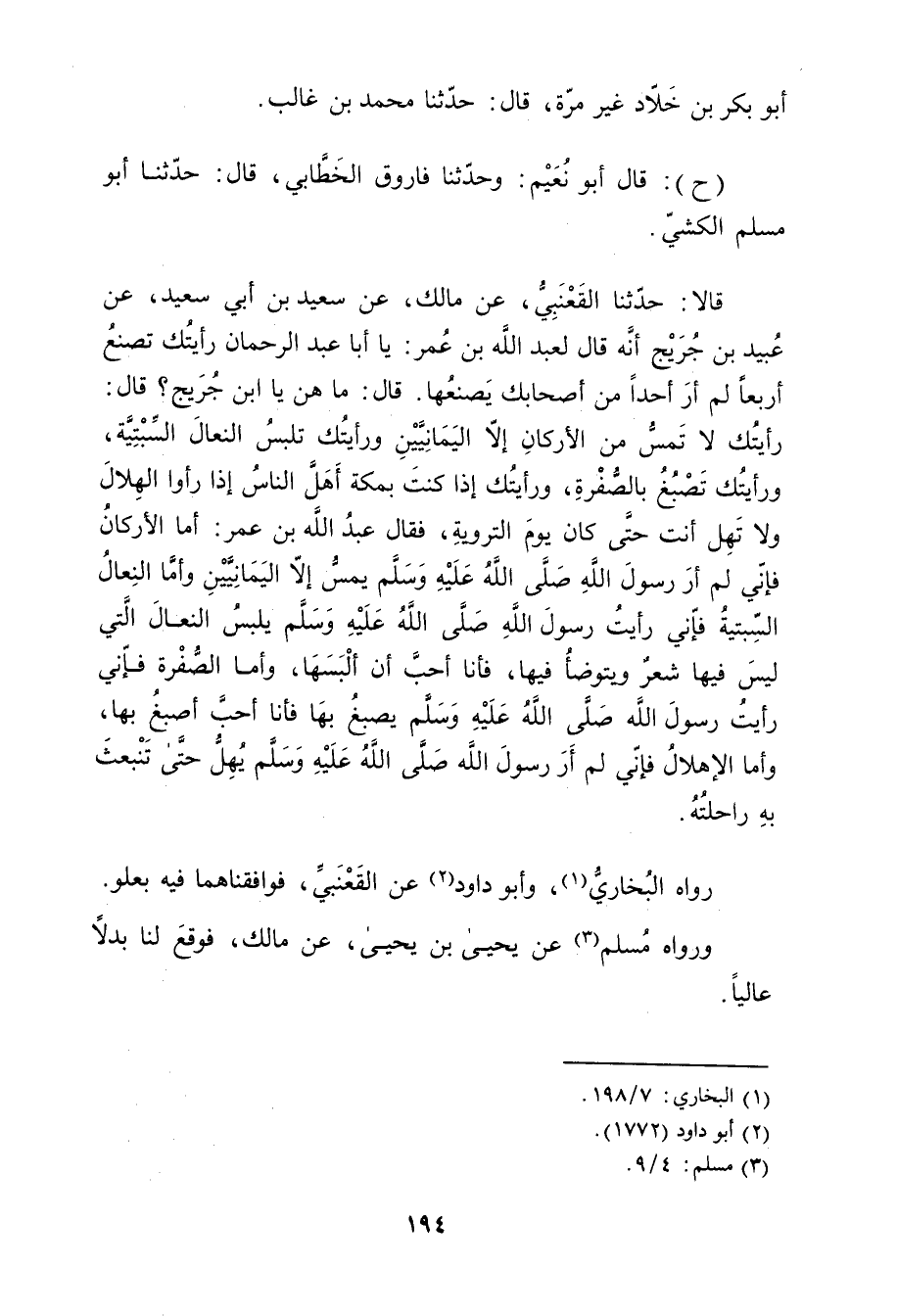 قَالا: حَدَّثَنَا الْقَعْنَبِيُّ، عَنْ مَالِكٍ، عَنْ سَعِيد بْنِ أَبي سَعِيد، عَنْ عُبَيد بْنِ جُرَيْج أَنَّهُ قال لِعَبْدِ الله بن عُمَر: يا أبا عَبْدِ الرَّحْمَنِ رَأَيْتُكَ تَصْنَعُ أَرْبَعًا لَمْ أَرَ أَحَدًا مِنْ أَصْحَابِكَ يَصْنَعُهَا.