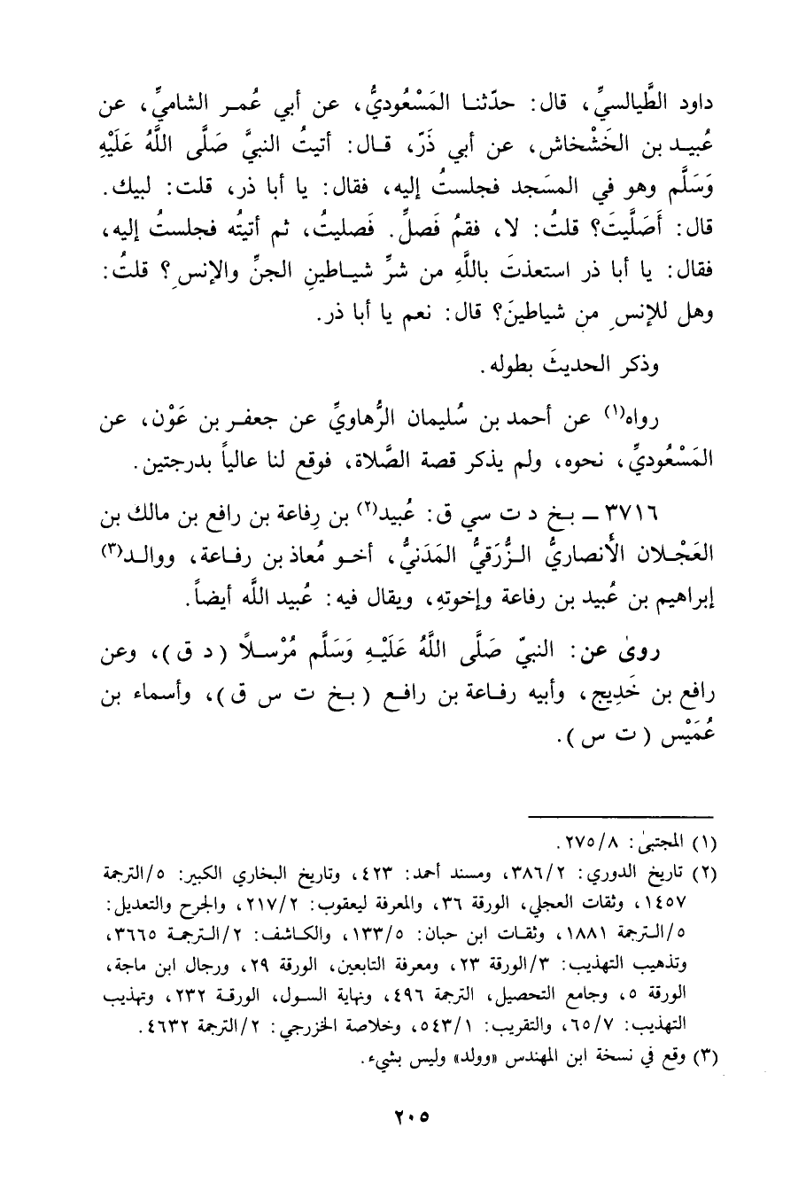 دَاوُدَ الطَّيَالِسِيِّ، قال: حَدَّثَنَا الْمَسْعُودِيُّ، عَن أَبِي عُمَر الشَّامِيِّ، عَنْ عُبَيد بْنِ الْخَشْخَاشِ، عَن أَبِي ذَرٍّ، قال: أَتَيْتُ النَّبِيَّ صلى الله عليه وسلم وهُوَ فِي الْمَسْجِدِ فَجَلَسْتُ إِلَيْهِ، فَقَالَ: يَا أَبَا ذَرٍّ، قُلْتُ: لَبَّيْكَ. قال: أصليت؟ قلت: لا، فَقُمْ فَصَلِّ. فَصَلَّيْتُ، ثُمَّ أَتَيْتُهُ فَجَلَسْتُ إِلَيْهِ، فَقَالَ: يَا أَبَا ذَرٍّ اسْتَعَذْتَ بِاللَّهِ مِنْ شَرِّ شَيَاطِينِ الْجِنِّ والإِنْسِ؟ قُلْت: وهَلْ لِلإِنْسِ مِنْ شَيَاطِينَ؟ قال: نَعَمْ يَا أَبَا ذَرٍ.