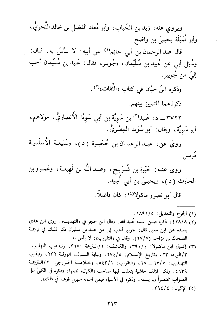(3) إكمال ابن ماكولا: 4 / 394، والكاشف: 2 / الترجمة 3670، وتذهيب التهذيب: 3 / الورقة 23، وتاريخ الاسلام: 5 / 274، ونهاية السول، الورقة 232، وتهذيب التهذيب: 7 / 67 - 68، والتقريب: 1 / 543، وخلاصة الخزرجي: 2 / الترجمة 4639. وذكر المؤلف حاشية يتعقب فيها صاحب "الكمال" نصها: ذكره في الكنى على الصواب مختصرا ولم يسمه، وذكره في الأَسماء فيمن اسمه سهيل فوهم في ذلك.
