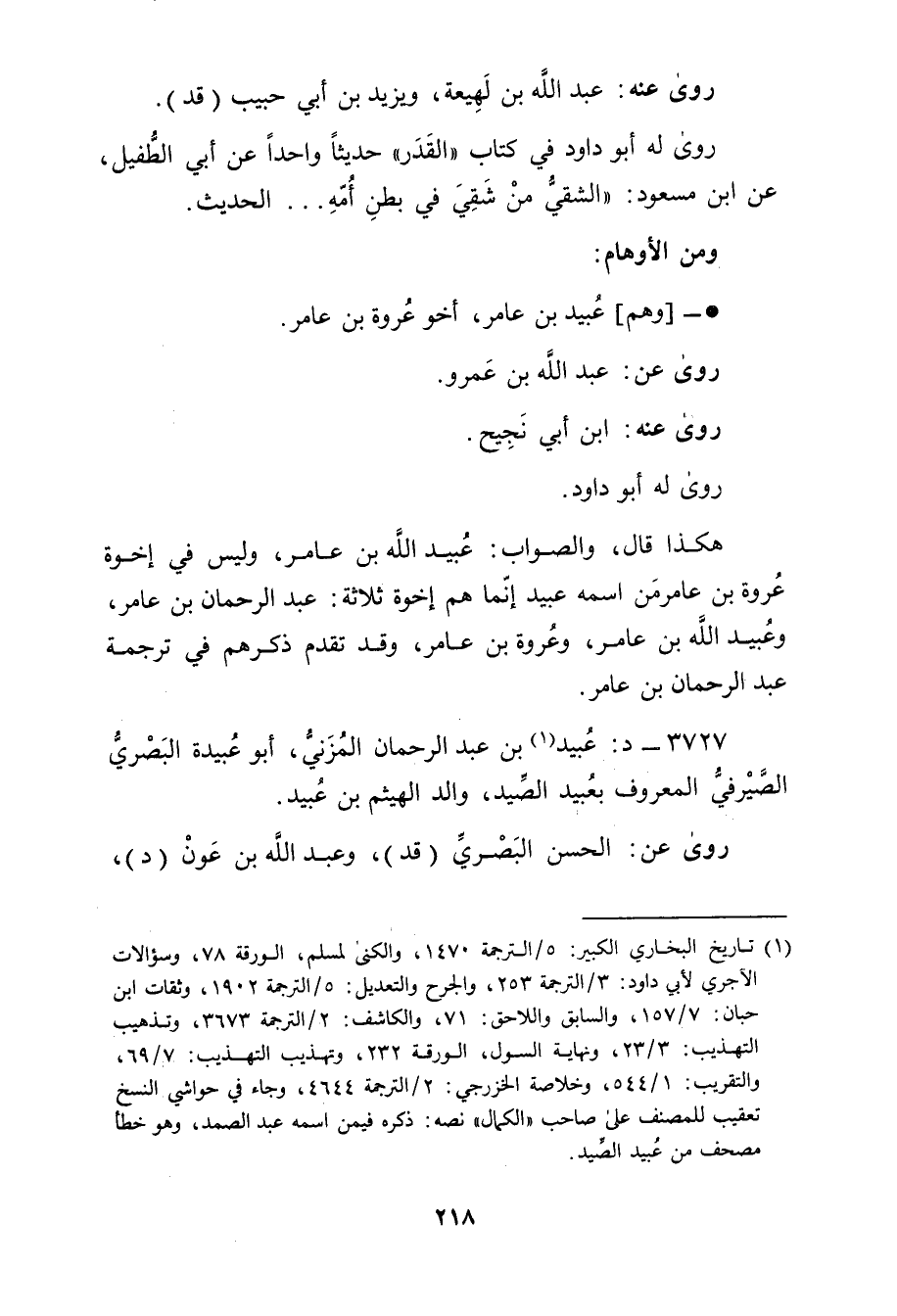 (1) تاريخ البخاري الكبير: 5 / الترجمة 1470، والكنى لمسلم، الورقة 78، وسؤالات الآجري لابي داود: 3 / الترجمة 253، والجرح والتعديل: 5 / الترجمة 1902، وثقات ابن حبان: 7 / 157، والسابق واللاحق: 71، والكاشف: 2 / الترجمة 3673، وتذهيب التهذيب: 3 / 23، ونهاية السول، الورقة 232، وتهذيب التهذيب: 7 / 69، والتقريب: 1 / 544، وخلاصة الخزرجي: 2 / الترجمة 4644، وجاء في حواشي النسخ تعقيب للمصنف على صاحب "الكمال" نصه: ذكره فيمن اسمه عبد الصمد، وهو خطأ مصحف من عُبَيد الصيد.