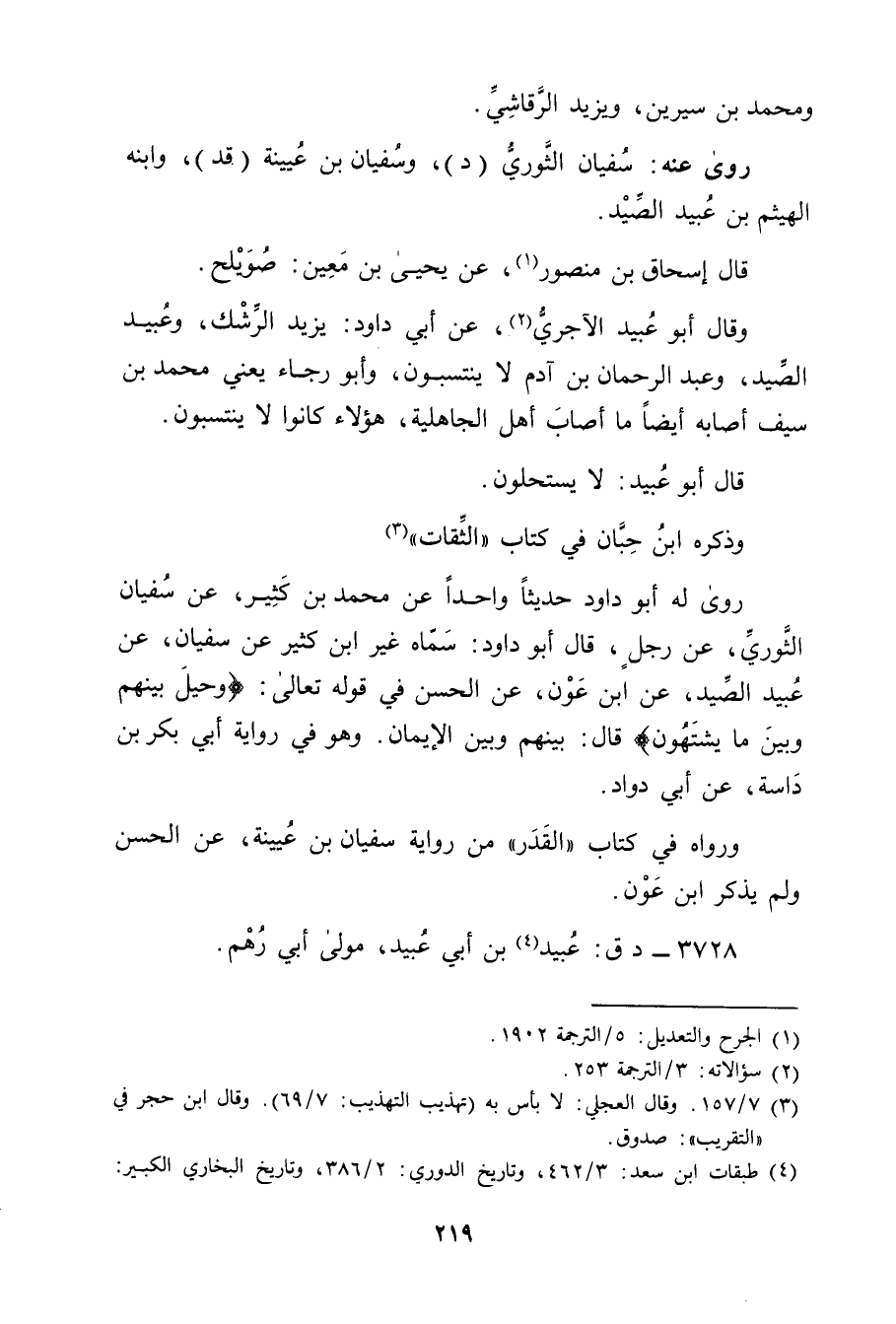وَقَال أبو عُبَيد الآجري (2) ، عَن أبي دَاوُد: يَزِيد الرشك، وعُبَيد الصيد، وعَبْد الرَّحْمَنِ بْن آدم لا ينتسبون، وأَبُو رجاء يَعْنِي مُحَمَّد بْن سَيْف أصابه أَيْضًا مَا أصاب أَهل الجاهلية، هَؤُلاءِ كَانُوا لا ينتسبون.