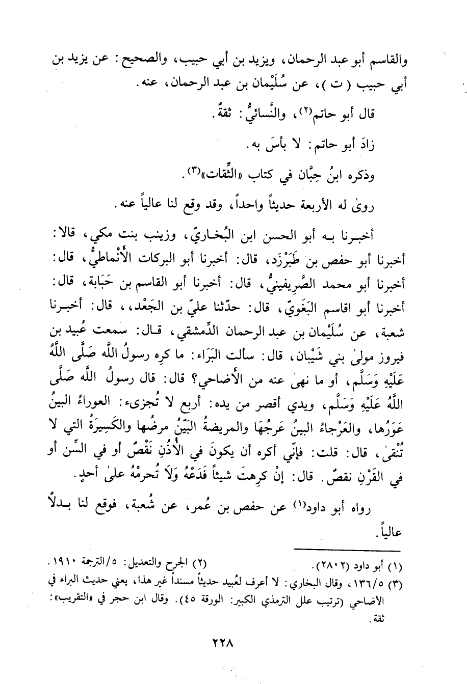 أَخْبَرَنَا بِهِ أَبُو الحسن بْن البخاري، وزينب بنت مكي، قَالا: أخبرنا أَبُو حفص بن طَبَرْزَذَ، قال: أَخْبَرَنَا أَبُو الْبَرَكَاتِ الأَنْمَاطِيُّ، قال: أخبرنا أَبُو مُحَمَّدٍ الصَّرِيفِينِيُّ، قال: حَدَّثَنَا أَبُو الْقَاسِمِ بْنُ حبابة، قال: أخبرنا أبواقاسم البغوي، قال: حَدَّثَنَا علي بْن الْجَعْدِ، قال: أَخْبَرَنَا شُعْبَةُ، عَنْ سُلَيْمان بْن عَبْد الرحمن الدمشقي، قال: شمعت عُبَيد بْنَ فَيْرُوزَ مَوْلَى بَنِي شَيْبَانَ، قال: سَأَلَتُ الْبَرَاءَ، مَا كَرِهَ رَسُولُ اللَّهِ صلى الله عليه وسلم، أَوْ مَا نَهَى عَنْهُ مِنَ الأَضَاحِي؟ قال: قال رَسُول اللَّهِ صلى الله عليه وسلم، ويَدِي أَقْصَرُ مِنْ يَدِهِ، أربع لا تجرئ: الْعَوْرَاءُ الْبَيِّنُ عَوَرُهَا، والْعَرْجَاءُ الْبَيِّنُ عَرَجُهَا، والْمَرِيضَةُ الْبَيِّنُ مَرَضُهَا والْكَسِيرَةُ الَّتِي لا تُنْقَى، قال: قُلْتُ: فَإِنِّي أَكْرَهُ أَنْ يَكُونَ فِي الأُذُنِ نَقْصٌ أَوْ فِي السِّنِّ أَوْ فِي الْقَرْنِ نَقْصٌ.
