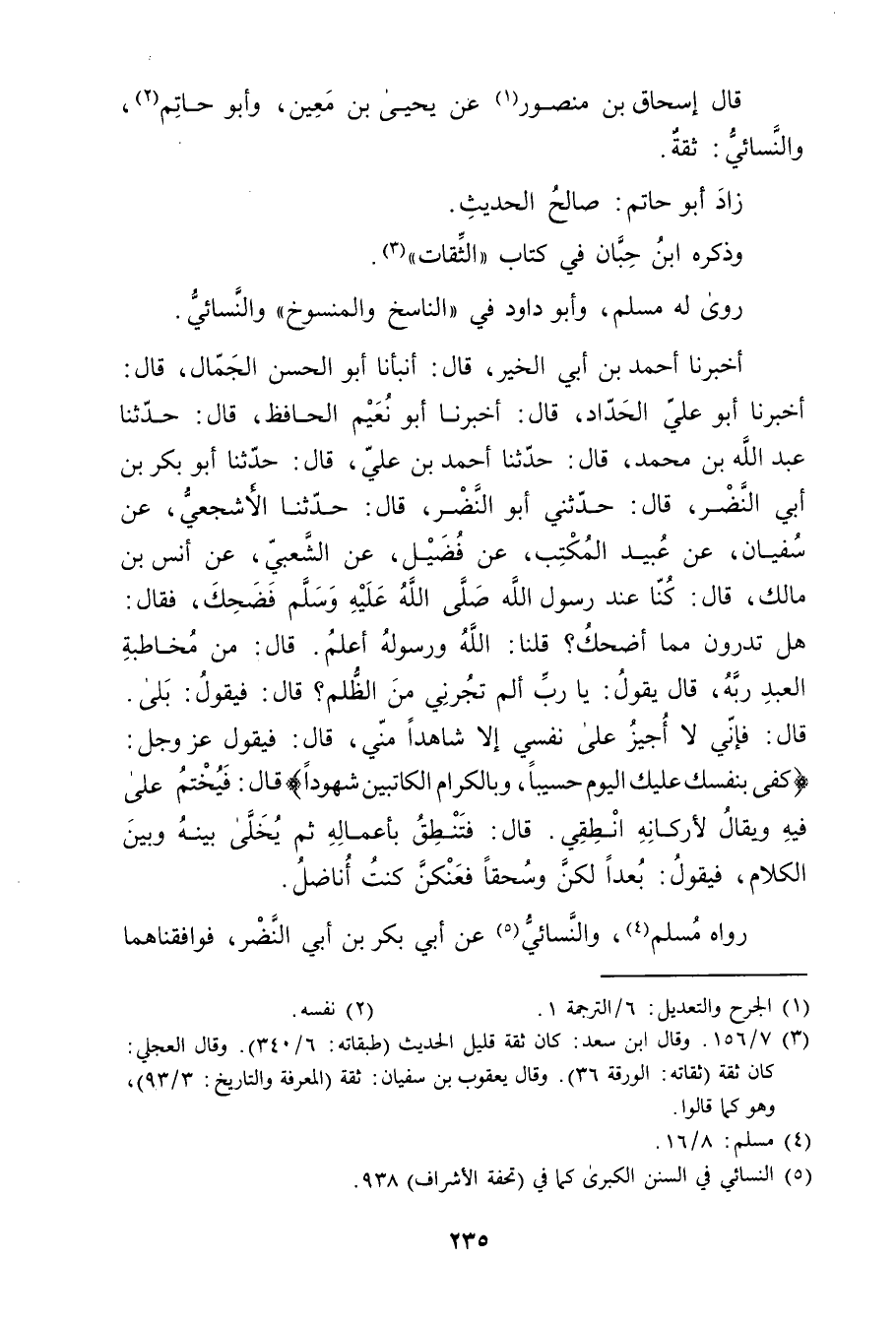 أخبرنا أَحْمَدُ بْن أَبي الخير، قال: أَنْبَأَنَا أَبُو الْحَسَنِ الجمال، قال: أَخْبَرَنَا أَبُو عَلِيّ الحداد، قال: أَخْبَرَنَا أَبُو نعيم الحافظ، قال: حَدَّثَنَا عَبد اللَّهِ بْن مُحَمَّد، قال: حَدَّثَنَا أحمد بْن علي، قال: حَدَّثَنَا أَبُو بَكْر بْن أَبي النضر، قال: حَدَّثَنِي أَبُو النضر، قال: حَدَّثَنَا الأَشْجَعِيُّ، عَنْ سُفْيَانَ، عَنْ عُبَيد الْمُكَتِّبِ، عَنْ فُضَيْلٍ، عَنِ الشَّعْبِيِّ، عَنْ أَنَسِ بْنِ مَالِكٍ، قال: كُنَّا عِنْدَ رَسُولِ اللَّهِ صلى الله عليه وسلم فَضَحِكَ، فَقَالَ: هَلْ تَدْرُونَ مِمَّا أَضْحَكُ؟ قُلْنَا: اللَّهُ ورَسُولُهُ أَعْلَمُ. قال: مِنْ مُخَاطَبَةِ الْعَبْدِ رَبَّهُ، قال يَقُولُ: يَا رَبِّ أَلَمْ تُجَرْنِي مِنَ الظُّلْمِ؟ قال: فَيَقُولُ: بَلَى. قال: فَإِنِّي لا أُجِيزُ عَلَى نَفْسِي إِلا شَاهِدًا مِنِّي، قال: فيقول عزوجل: (كفى بنفسك عليك اليوم حسيباً، وبالْكِرَامِ الْكَاتِبِينَ شُهُودًا) قال: فَيُخْتَمُ عَلَى فِيهِ ويُقال لأَرْكَانِهِ انْطِقِي. قال: فَتَنْطِقُ بِأَعْمَالِهِ ثُمَّ يُخَلَّى بَيْنَهُ وبَيْنَ الْكَلامِ، فَيَقُولُ: بُعْدًا لَكُنَّ وسُحْقًا فَعْنُكُنَّ كُنْتُ أُنَاضِلُ.