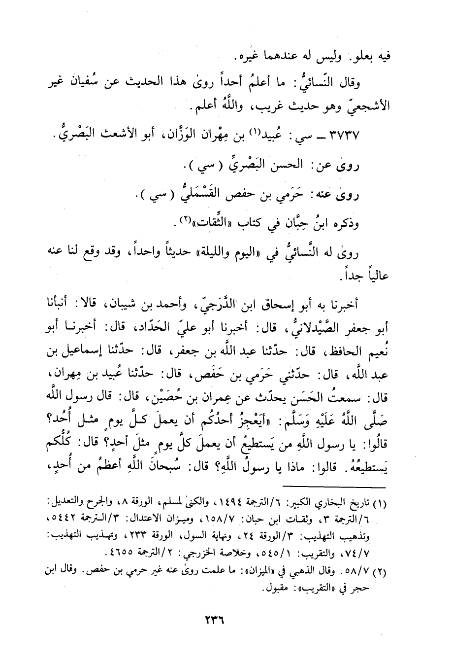 أَخْبَرَنَا بِهِ أَبُو إِسْحَاقَ ابْنُ الدَّرَجِيِّ، وأَحْمَدُ بْنُ شَيْبَانَ، قالا: أَنْبَأَنَا أَبُو جَعْفَرٍ الصَّيْدَلانِيُّ، قال: أَخْبَرَنَا أَبُو عَلِيّ الحداد، قال: أَخْبَرَنَا أَبُو نعيم الحافظ، قال: حَدَّثَنَا عَبد اللَّهِ بْنُ جَعْفَرٍ، قال: حَدَّثَنَا إِسماعيل بْنُ عَبد اللَّهِ، قال: حَدَّثَنِي حَرْمِيُّ بْنُ حَفْصٍ، قال: حَدَّثَنَا عُبَيد بْنُ مَهْرَانَ، قال: سَمِعْتُ الْحَسَنَ يُحَدِّثُ عَنْ عِمْران بْنِ حُصَيْنٍ، قال: قال رَسُولُ اللَّهِ صلى الله عليه وسلم: أَيَعْجَزُ أَحَدُكُمْ أَنْ يَعْمَلَ كُلَّ يَوْمٍ مِثْلَ أُحُدٍ؟ قَالُوا: يَا رَسُولَ اللَّهِ مَنْ يَسْتَطِيعُ أَنْ يَعْمَلَ كُلَّ يَوْمٍ مِثْلَ أُحُدٍ؟ قال: كُلُّكُمْ يَسْتَطِيعُهُ. قَالُوا: مَاذَا يَا رَسُولَ اللَّهِ؟ قال: سُبْحَانَ الله أعظم من أحد،