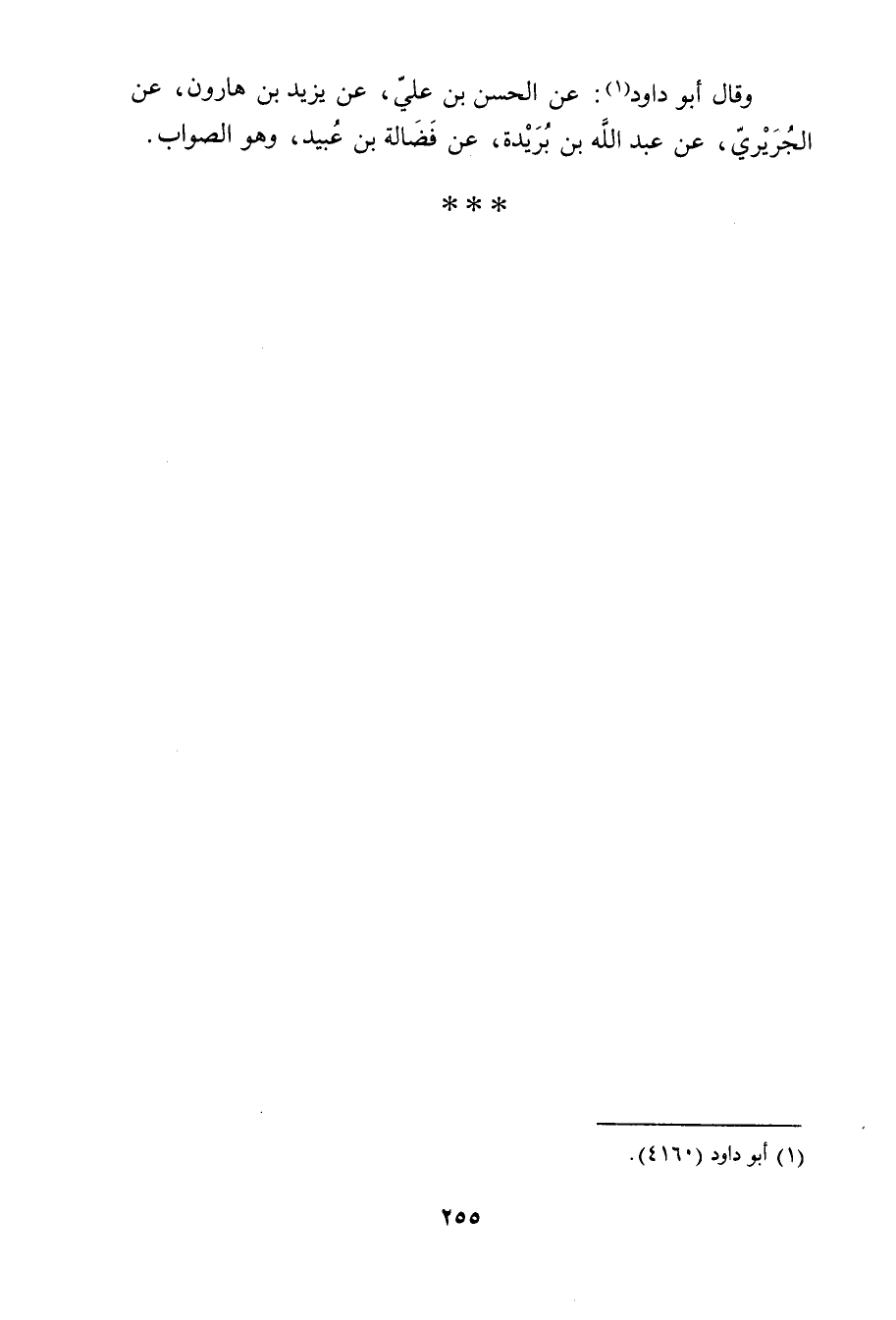وَقَال أَبُو دَاوُدَ (1) : عَنِ الْحَسَن بْن عَلِيٍّ، عَنْ يزيد بْن هَارُون، عَنِ الجريري، عَنْ عَبد اللَّهِ بْن بريدة، عَنْ فضالة بن عُبَيد، وهو الصواب.