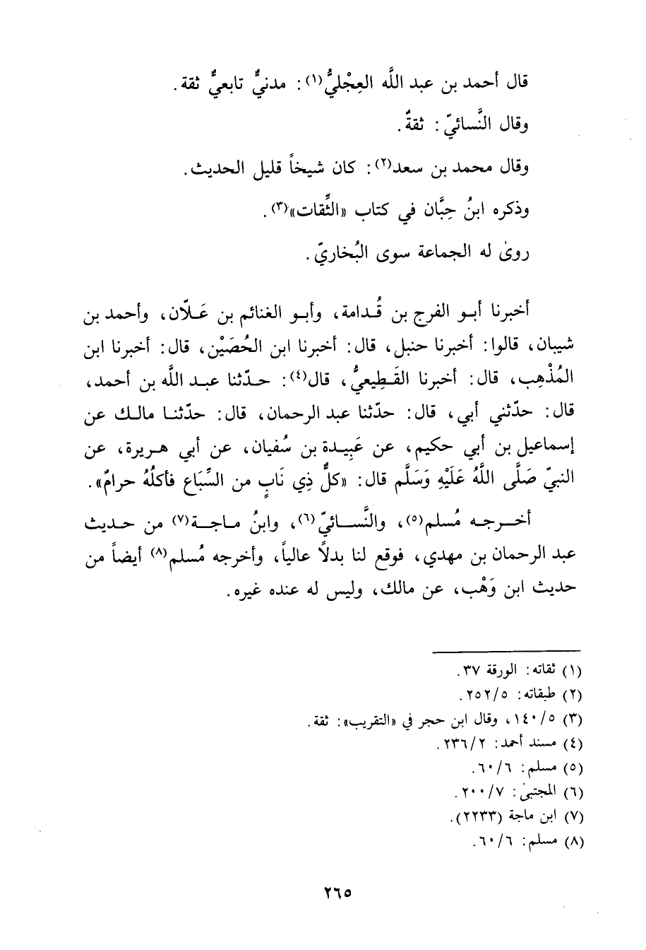أخبرنا أَبُو الْفَرَجِ بْنُ قُدَامَةَ، وأبو الغنائم بْن علان، وأحمد بْنُ شَيْبَانَ، قَالُوا: أَخْبَرَنَا حَنْبَلُ، قال: أخبرنا ابن الحصين، قال: أخبرنا ابْنُ الْمُذْهِب، قال: أخبرنا القَطِيعِيّ، قال (4) : حَدَّثَنَا عَبد الله بْن أَحْمَدَ، قال: حَدَّثني أبي، قال: حَدَّثَنَا عَبْدُ الرَّحْمَنِ، قال: حَدَّثَنَا مَالِكٌ عَنْ إِسماعيل بْنِ أَبي حَكِيمٍ، عَنْ عُبَيدة بْنِ سُفْيَانَ، عَن أَبِي هُرَيْرة، عَنِ النَّبِيُّ صلى الله عليه وسلم قال: كُلُّ ذِي نَابٍ مِنَ السِّبَاعِ فَأَكْلُهُ حَرَامٌ.