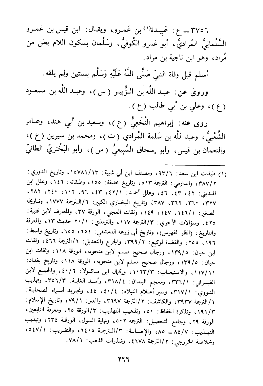 3756 - ع: عُبَيدة بن عَمْرو (1) ، ويُقال: ابْن قَيْس بْن عَمْرو السلماني المرادي، أَبُو عَمْرو الكوفي، وسلمان بسكون اللام بطن من مراد، وهُوَ ابْن ناجية بْن مراد.