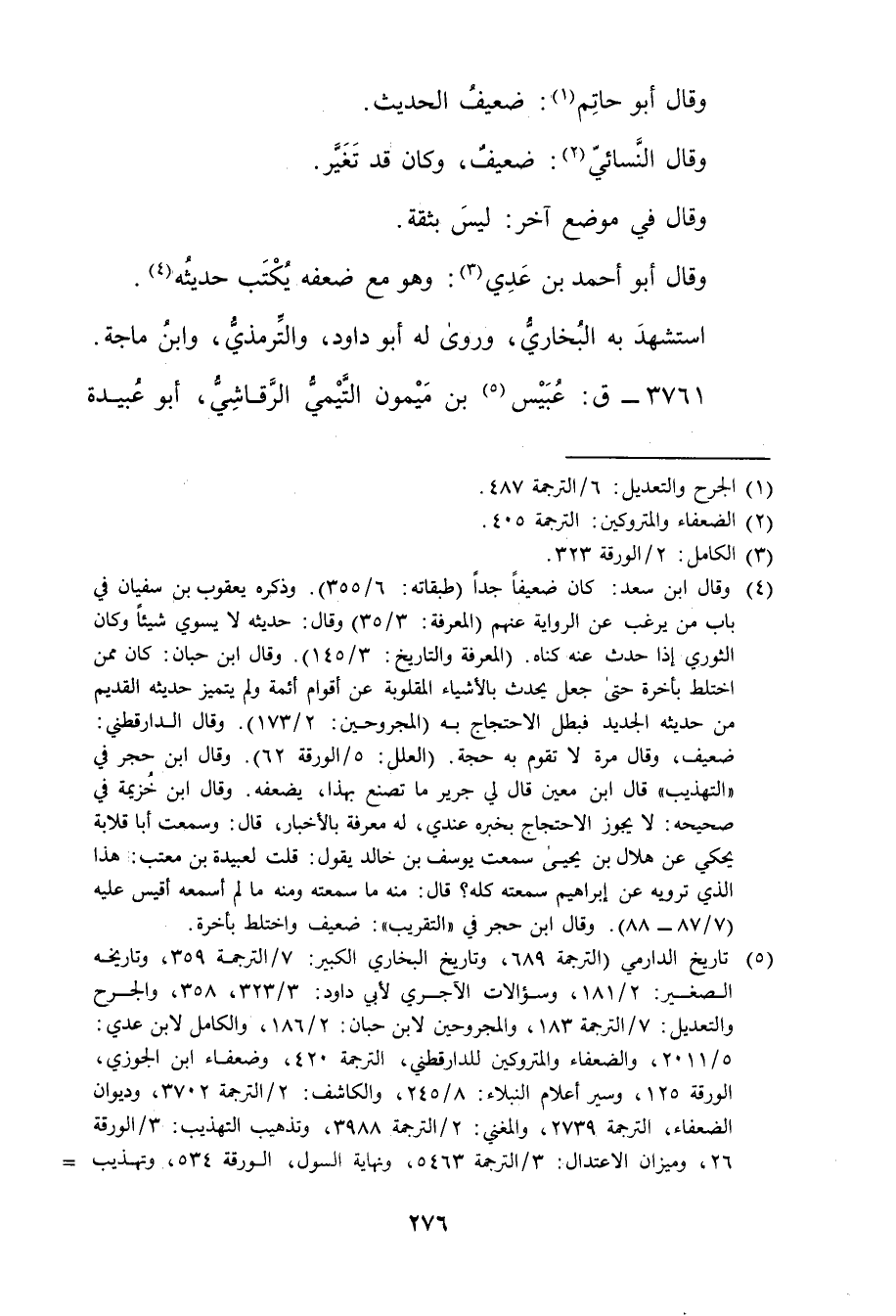 (5) تاريخ الدارمي (الترجمة 689، وتاريخ البخاري الكبير: 7 / الترجمة 359، وتاريخه الصغير: 2 / الترجمة 181، وسؤالات الآجري لابي داود: 3 / 323، 358، والجرح والتعديل: 7 / الترجمة 183، والمجروحين لابن حبان: 2 / 186، والكامل لابن عدي: 5 / 2011، والضعفاء والمتروكين للدارقطني، الترجمة 420، وضعفاء ابن الجوزي، الورقة 125، وسير أعلام النبلاء: 8 / 245، والكاشف: 2 / الترجمة 3702، وديوان الضعفاء، الترجمة 2739، والمغني: 2 / الترجمة 5463، ونهاية السول، الورقة 534، وتهذيب =