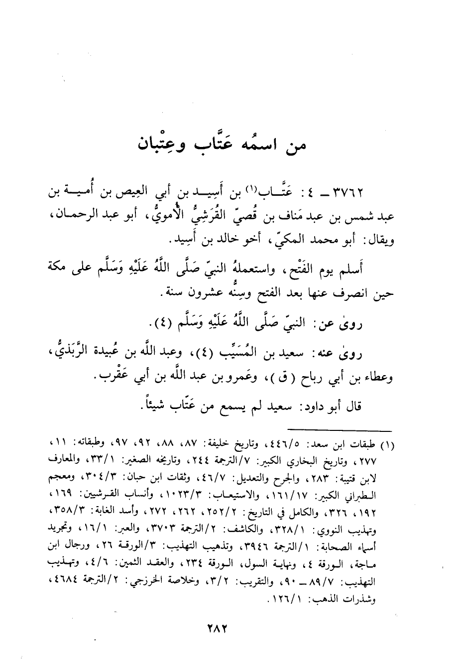 3762 - 4: عتاب بْن أسيد بْن أَبي العيص بن أمية بن عَبْد شمس بْن عَبْد مناف بْن قصي الْقُرَشِي الأُمَوِي (1) ، أَبُو عَبْد الرحمن، ويُقال: أَبُو مُحَمَّد الْمَكِّي، أَخُو خَالِد بْن أسيد.
