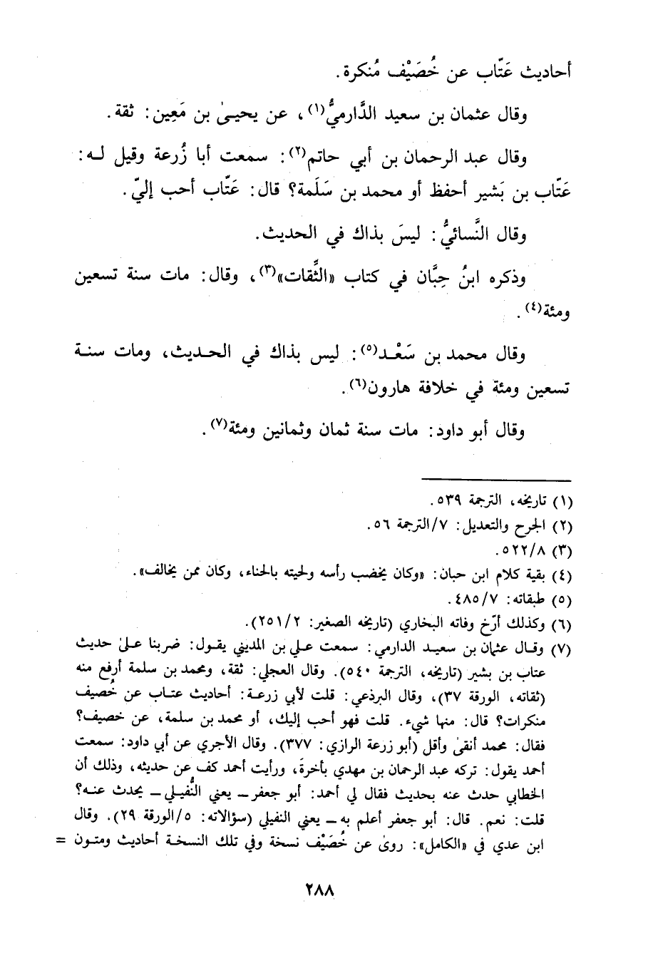 (7) وَقَال عثمان بْن سَعِيد الدارمي: سمعت علي بْن المديني يَقُول: ضربنا على حديث عتاب بن بشير (تاريخه: الترجمة 540) . وَقَال العجلي: ثقة، ومحمد بن سلمة أرفع منه (ثقاته، الورقة 37) ، وَقَال البرذعي: قلتُ لأبي زرعة: أحاديث عتاب عن خصيف منكرات؟ قال: منها شئ. قلت فهو أحب إليك، أو محمد بن سلمة، عن خصيف؟ فقال: محمد أنقى وأقل (أبو زُرْعَة الرازي: 377) . وَقَال الآجُرِّيّ عَن أبي داود: سمعت أحمد يقول: تركه عبد الرحمن بن مهدي بأخرة، ورأيت أحمد كف عن حديثه، وذلك أن الخطابي حدث عنه بحديث فقال لي أحمد: أبو جعفر، يعني النفيلي - يحدث عنه؟ قلت: نعم. قال: أبو جعفر أعلم به، يعني النفيلي (سؤالاته: 5 / الورقة 29) . وَقَال ابن عدي في "الكامل": روى عن خصيف نسخة وفي تلك النسخة أحاديث ومتون =