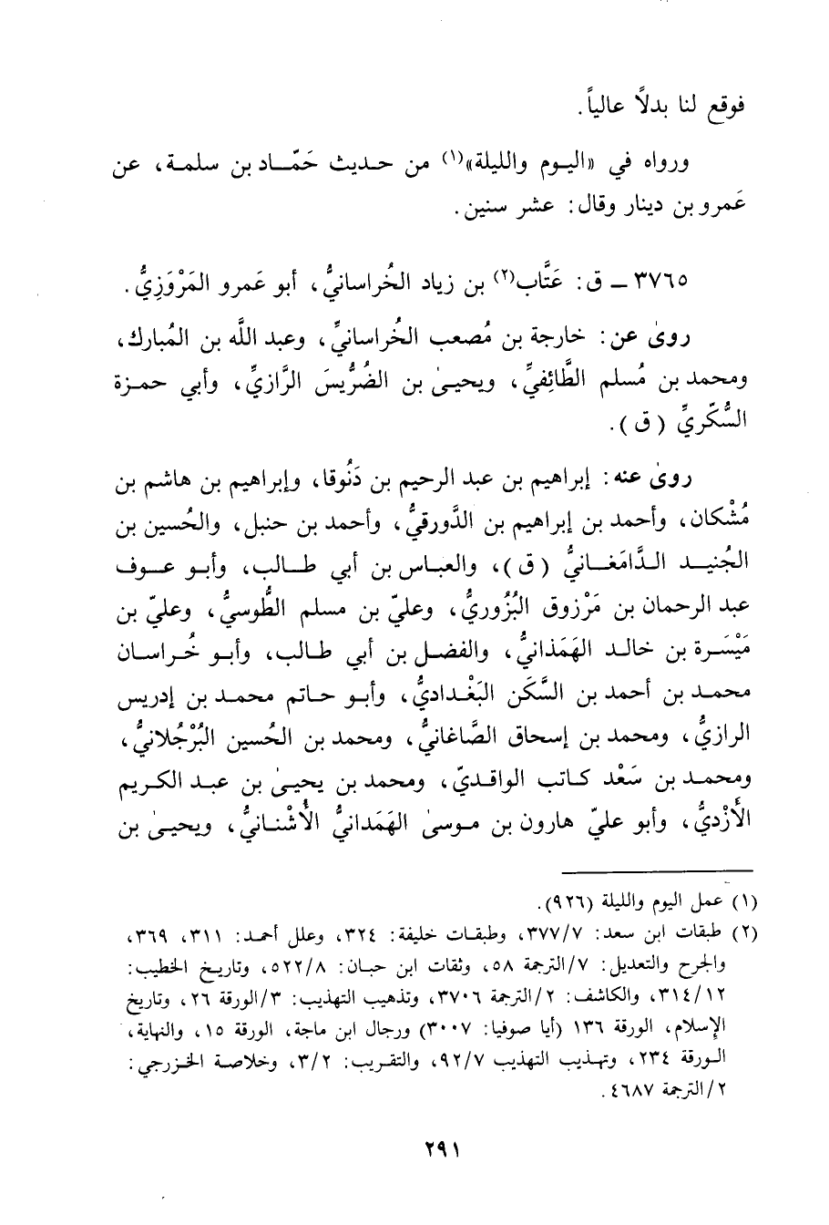 (2) طبقات ابن سعد: 7 / 377، وطبقات خليفة: 324، وعلل أحمد: 311، 369، والجرح والتعديل: 7 / الترجمة 58، وثقات ابن حبان: 8 / 522، وتاريخ الخطيب: 12 / 314، والكاشف: 2 / الترجمة 3706، وتذهيب التهذيب: 3 / الورقة 26، وتاريخ الاسلام، الورقة 136 (أيا صوفيا: 3007) ورجال ابن ماجة، الورقة 15، والنهاية، الورقة 234، وتهذيب التهذيب 7 / 92، والتقريب: 2 / 3، وخلاصة الخزرجي: 2 / الترجمة 4687.