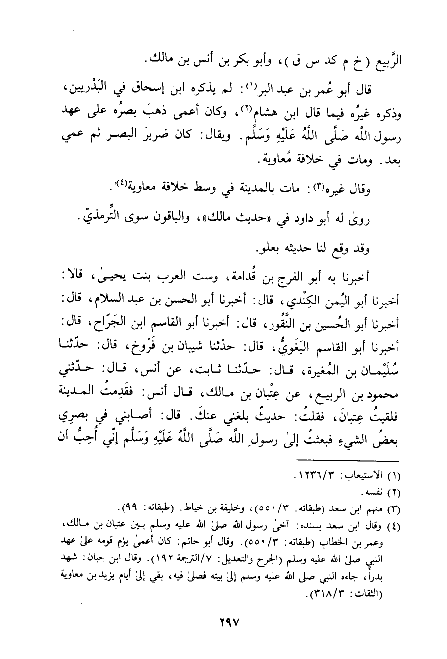 (4) وَقَال ابن سعد بسنده: آخى رَسُول اللَّه صَلَّى اللَّهُ عليه وسلم بين عتبان بن مالك، وعُمَر بن الخطاب (طبقاته: 3 / 550) . وَقَال أبو حاتم: كان أعمى يؤم قومه على عهد النَّبِيّ صَلَّى اللَّهُ عليه وسلم (الجرح والتعديل: 7 / الترجمة 192) . وَقَال ابن حبان: شهد