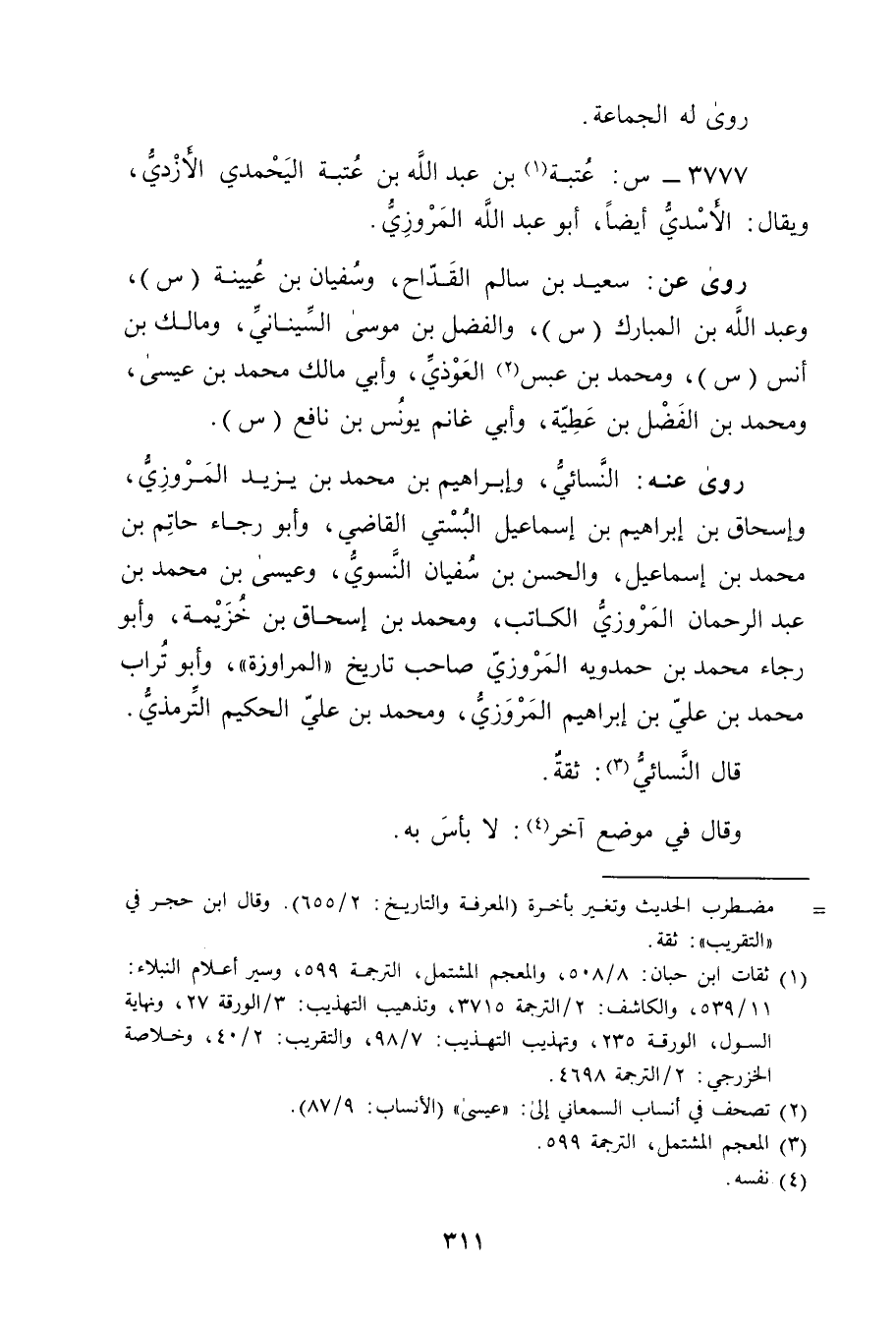 3777 - س: عتبة بن عَبد اللَّهِ بن عتبة اليحمدي الأزدي (1) ، ويُقال: الأسدي أَيْضًا، أَبُو عَبْد اللَّهِ المروزي.
