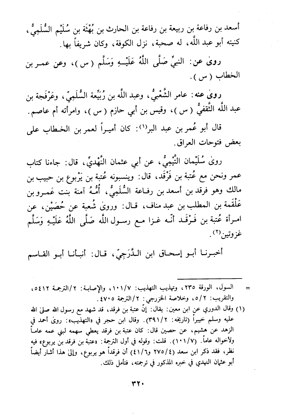 (7 / 101) . قلت: وقوله: في أول الترجمة: عتبة بن فرقد بن يربوع"فيه نظر، فقد ذكر ابن سعد (4 / 275 و6 / 41) أن فرقدا هو يربوع، والى هذا أشار أيضا أبو عثمان النهدي في خبره المذكور في ترجمته، فتأمل ذلك.