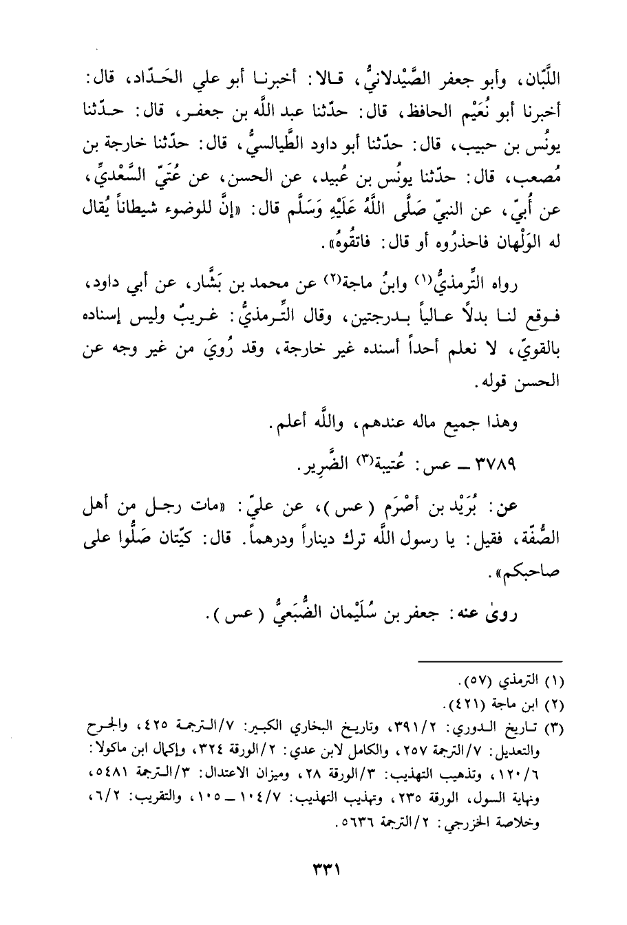 اللبان، وأبو جعفر الصيدلاني، قالا: أَخْبَرَنَا أَبُو عَلِيّ الحداد، قال: أَخْبَرَنَا أبو نعيم الحافظ، قال: حَدَّثَنَا عَبد الله بْن جعفر، قال: حَدَّثَنَا يُونُسُ بْنُ حَبِيبٍ، قال: حَدَّثَنَا عَبد اللَّهِ بْن جَعْفَرٍ، قال: حَدَّثَنَا يُونُسُ بْنُ حَبِيبٍ، قال: حَدَّثَنَا أَبُو دَاوُدَ الطَّيَالِسِيُّ، قال: حَدَّثَنَا خَارِجَةُ بْنُ مُصْعَبٍ، قال: حَدَّثَنَا يُونُسُ بْنُ عُبَيد، عَنِ الْحَسَنِ، عَنْ عُتَيٍّ السَّعْدِيٍّ، عَن أَبِي، عَنِ النَّبِيِّ صلى الله عليه وسلم قال: إِنَّ لِلْوُضُوءِ شَيْطَانًا يُقَالَ لَهُ الْوَلْهَانُ فَاحْذَرُوهُ أَوْ قال: فَاتَّقُوهُ.