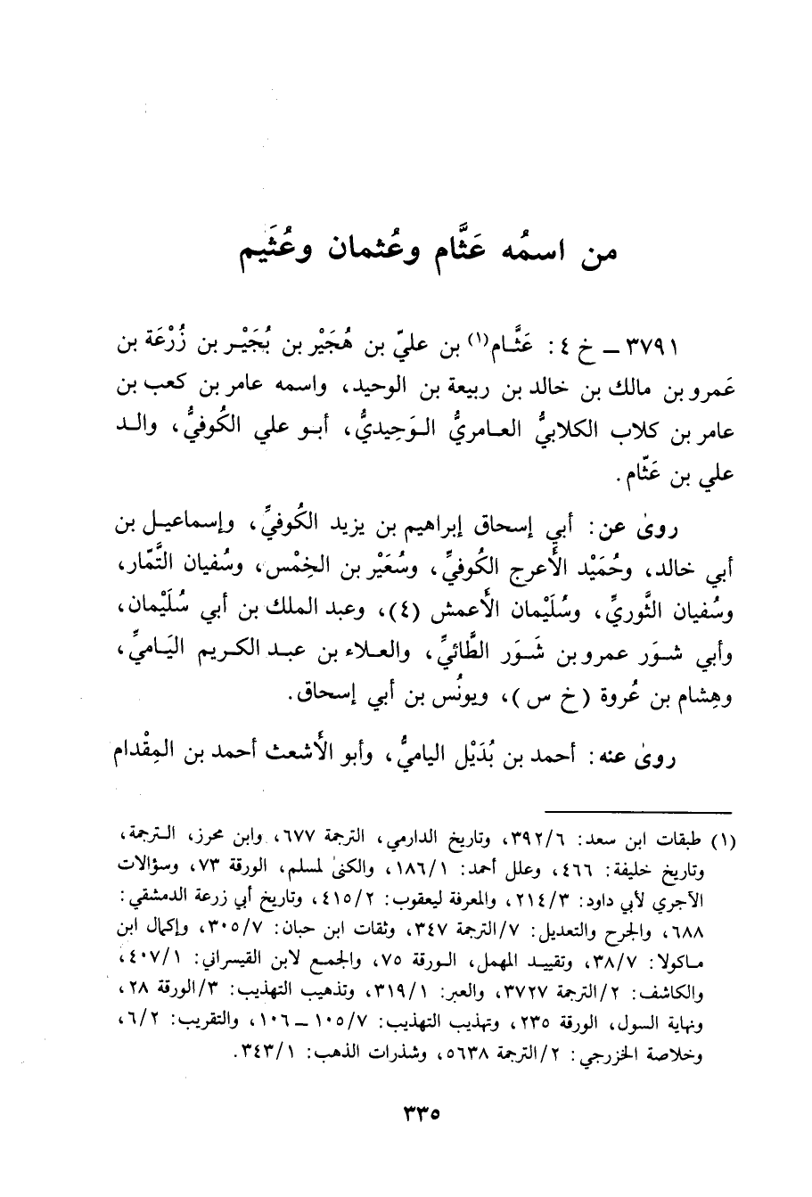 3791 - خ 4: عثام بن عَلِي بن هجير بن بجير بن زرعة بن عَمْرو بن مالك بن خَالِد بن ربيعة بن الوحيد (1) ، واسمه عامر بْن كعب بْن عامر بن جلاب الكِلابي العامري الوحيدي، أَبُو عَلِي الكوفي، والد عَلِي بْن عثام.