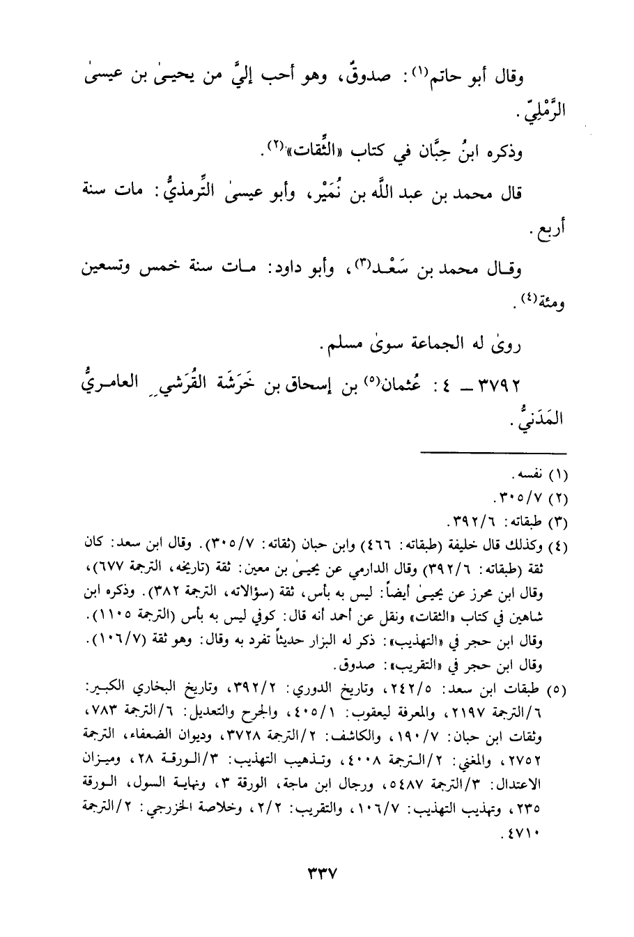 3792 - 4: عُثْمَان بن إِسْحَاق بن خرشة القرشي العامري المدني (5) .