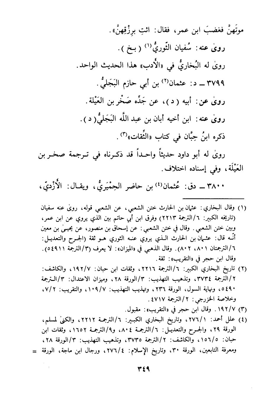 (تاريخه الكبير: 6 / الترجمة 2213) وفرق ابن أَبي حاتم بين الذي بروي عن ابن عُمَر، وبين ختن الشعبي. وَقَال في ختن الشعبي: عَنْ إِسْحَاقَ بْنِ مَنْصُورٍ، عَنْ يَحْيَى بْن مَعِين إنه قال: عثمان بن الحارث الذي يروي عنه الثوري هو ثقة (الجرح والتعديل: 6 / الترجمتان 801، 802) . وَقَال الذهبي في "الميزان": لا يعرف (3 / الترجمة 54911) . وَقَال ابن حجر في "التقريب": ثقة.