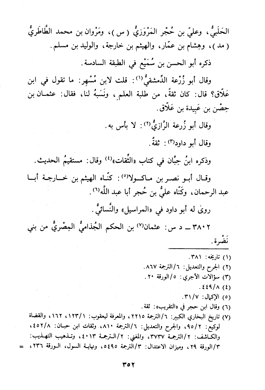 وَقَال أَبُو زُرْعَة الدمشقي (1) : قُلْت لابن مسهر: ما تقول في ابن علاق؟ قال: كَانَ ثقة، من طلبة العلم، ونسبه لنا، فَقَالَ: عُثْمَان بْن حصن بْن عُبَيدة بْن علاق.