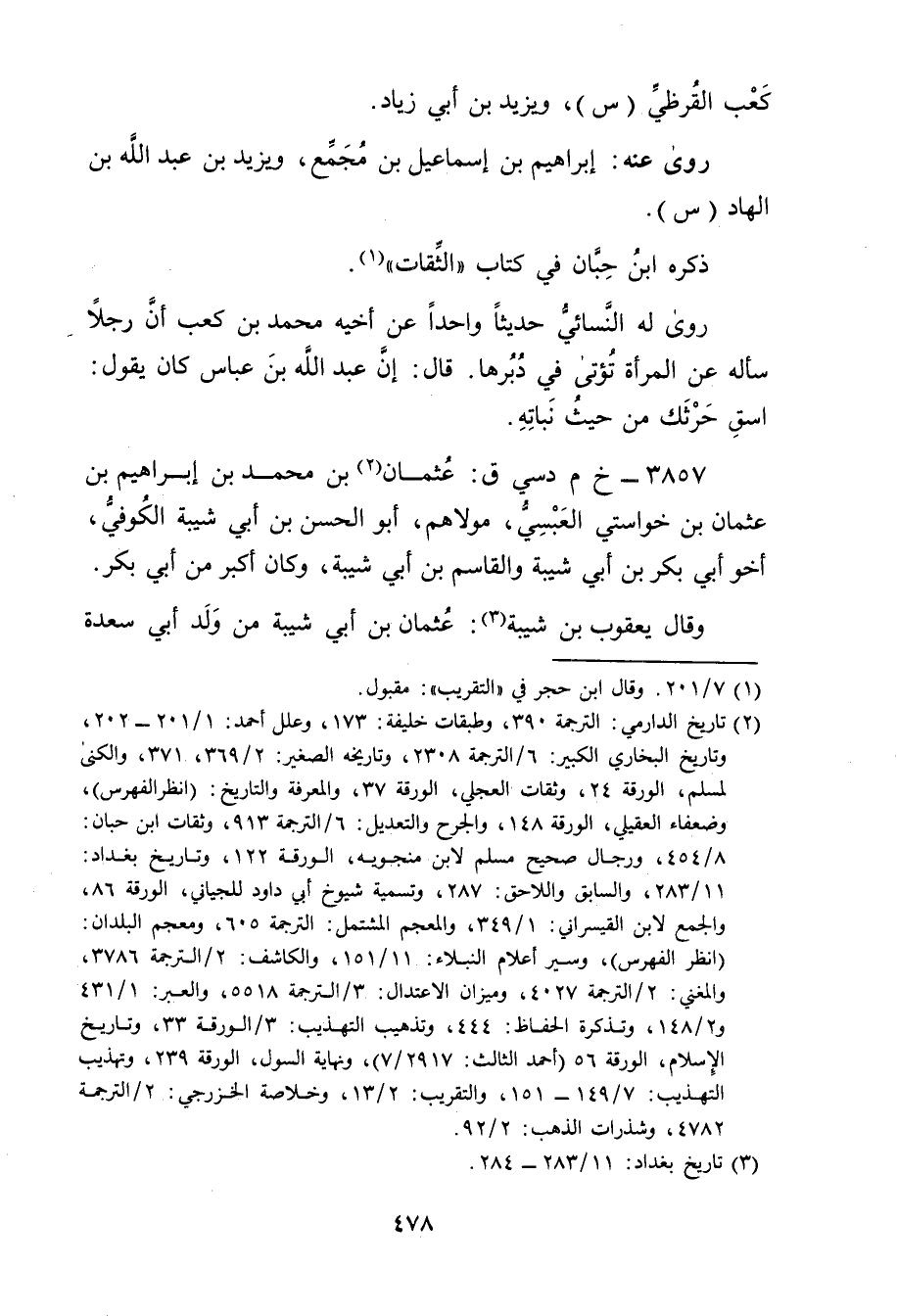 3857 - خ م دسي ق: عُثْمَان بن مُحَمَّد بن إِبْرَاهِيم بن عثمان بن خواستي العبسي (2) ، مولاهم، أَبُو الْحَسَنِ بْنُ أَبي شَيْبَة الكوفي، أَخُو أَبِي بَكْر بْن أَبي شَيْبَة والقاسم بْن أَبي شَيْبَة، وكَانَ أكبر من أَبِي بَكْر.