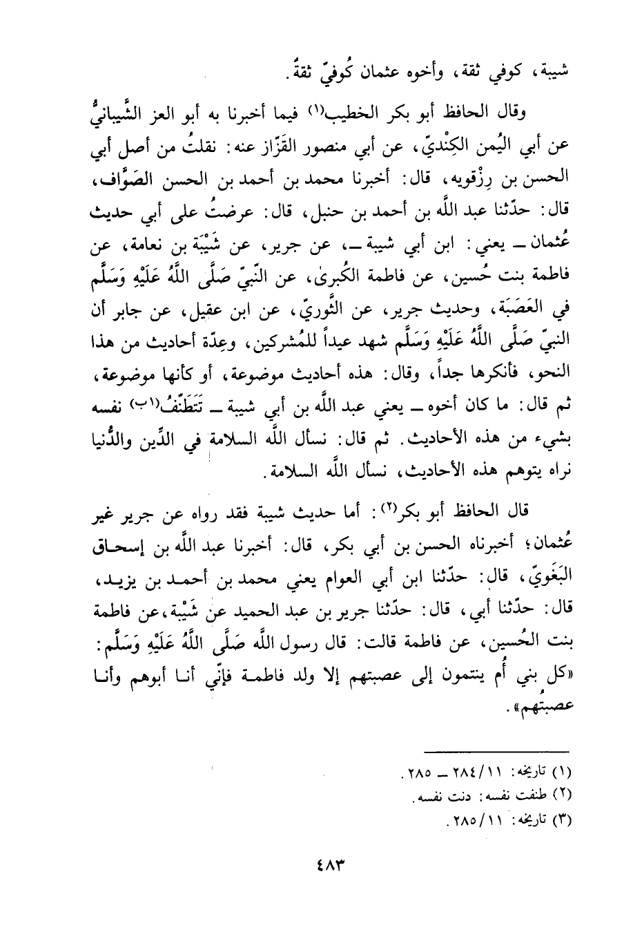 وَقَال الْحَافِظ أَبُو بكر الخطيب (1) فيما أَخْبَرَنَا به أَبُو الْعِزِّ الشَّيْبَانِيُّ عَن أَبِي الْيُمْنِ الْكُنْدِيِّ، عَن أَبِي مَنْصُورٍ القزاز عَنه: نقلت من أصل أَبِي الْحَسَن بْن رزقويه، قال: أَخْبَرَنَا مُحَمَّد بْن أَحْمَد بْن الْحَسَن الصواف، قال: حَدَّثَنَا عَبد اللَّهِ بْن أَحْمَد بْن حنبل، قال: عرضت عَلَى أَبِي حَدِيث عُثْمَان، يَعْنِي: ابْن أَبي شَيْبَة، عَنْ جَرِير، عَنْ شَيْبَة بْن نعامة، عَنْ فَاطِمَة بِنْت حسين، عَنْ فَاطِمَة الكبرى، عَنِ النَّبِي صلى الله عليه وسلم فِي العصبة، وحَدِيث جَرِير، عَنِ الثَّوْرِي، عَنِ ابْن عقيل، عَنْ جَابِر أَنَّ النَّبِيَّ صلى الله عليه وسلم شهد عيدا للمشركين، وعدة أحاديث من هَذَا النحو، فأنكرها جدا، وَقَال: هذه أحاديث موضوعة، أَوْ كَأَنَّهَا موضوعة، ثُمَّ قال: مَا كَانَ أخوه، يَعْنِي عَبد اللَّهِ بْن أَبي شَيْبَة - تتطنف (1 ب) نَفْسه بشيءٍ من هذه الأحاديث.