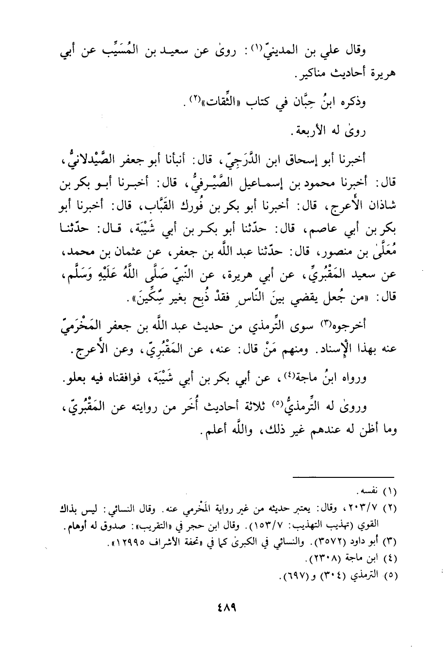 أخبرنا إِسْحَاقَ ابْنُ الدَّرَجِيِّ، قال: أَنْبَأَنَا أَبُو جَعْفَرٍ الصَّيْدَلانِيُّ، قال: أَخْبَرَنَا مَحْمُودُ بْنُ إِسماعيل الصَّيْرَفِيُّ، قال: أَخْبَرَنَا أَبُو بَكْرِ بْنُ شَاذَانَ الأَعْرَجُ، قال: أَخْبَرَنَا أَبُو بَكْرِ بْنُ فُوُرَكَ الْقَبَّابُ، قال: أَخْبَرَنَا أَبُو بَكْر بْن أَبي عاصم، قال: حَدَّثَنَا أبو بكر بْن أَبي شَيْبَة، قال: حَدَّثَنَا مُعَلَّى بْن منصور، قال: حَدَّثَنَا عَبد اللَّهِ بْنُ جَعْفَرٍ، عَنْ عُثْمَانَ بْنَ مُحَمَّدٍ، عَنْ سَعِيد الْمَقْبُرِيِّ، عَن أَبِي هُرَيْرة، عَنِ النَّبِيِّ صلى الله عليه وسلم، قال: مَنْ جُعَلَ يَقْضِي بَيْنَ النَّاسِ فَقَدْ ذُبِحَ بِغَيْرِ سِكِّينٍ.