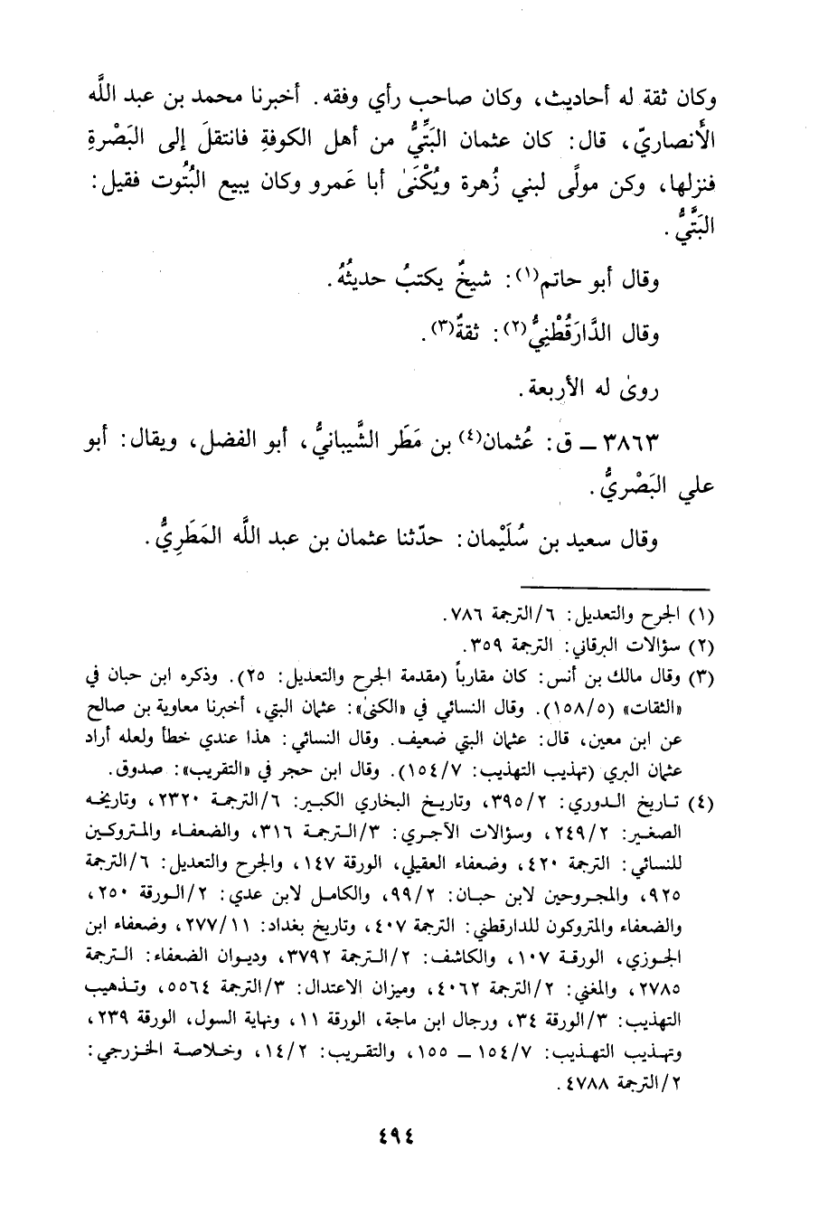 (3) وَقَال مالك بْن أنس: كان مقاربا (مقدمة الجرح والتعديل: 25) ، وذَكَره ابنُ حِبَّان في "الثقات" (5 / 158) . وَقَال النَّسَائي في "الكنى": عثمان البتي، أخبرنا معاوية بن صالح عن ابن مَعِين، قال: عثمان البتي ضعيف. وَقَال النَّسَائي: هذا عندي خطأ ولعله أراد عثمان البري (تهذيب التهذيب: 7 / 154) . وَقَال ابن حجر في "التقريب": صدوق.