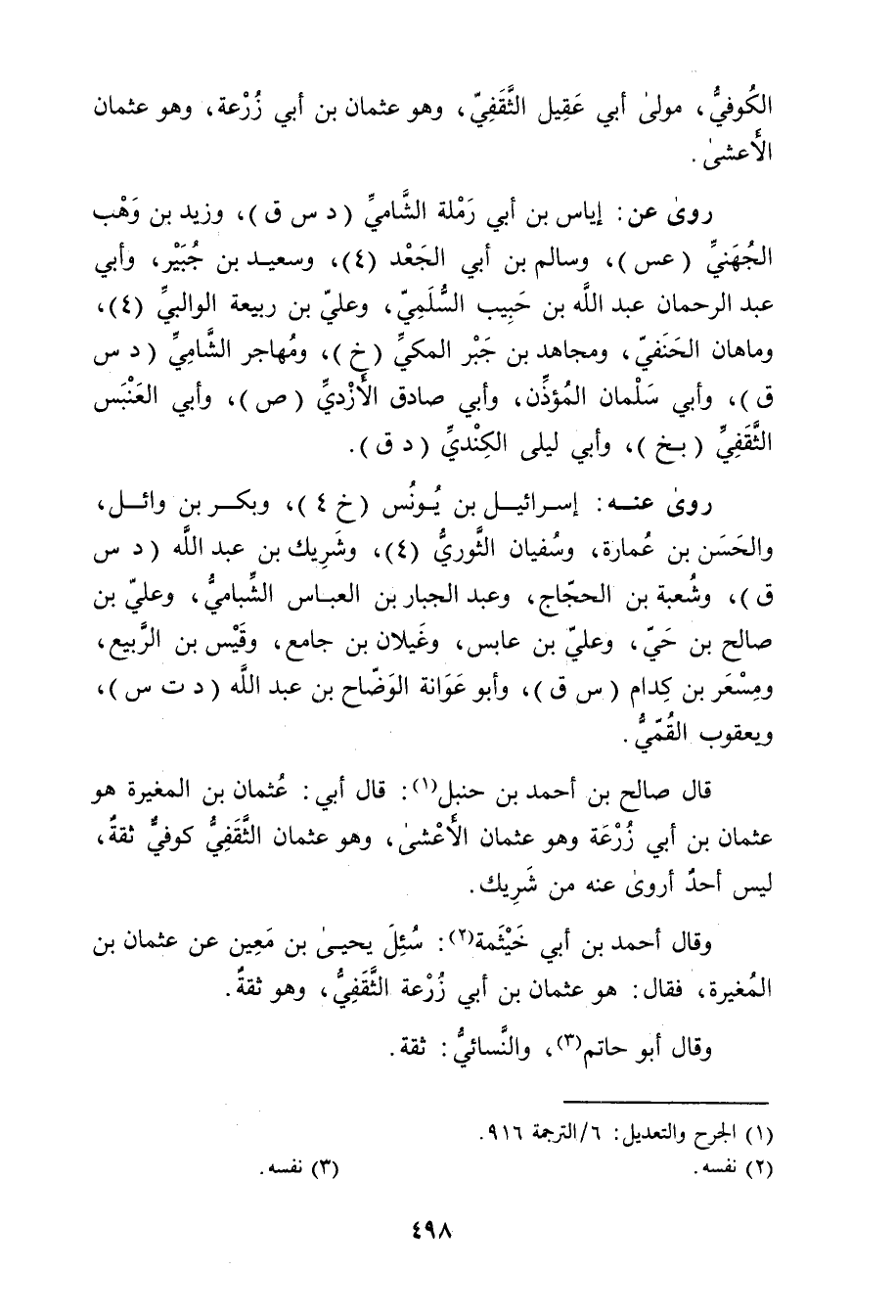 قال صَالِح بْن أَحْمَد بْن حنبل (1) : قال أَبِي: عُثْمَان بْن الْمُغِيرَة هُوَ عُثْمَان بْن أَبي زرعة وهُوَ عُثْمَان الأعشى، وهُوَ عُثْمَان الثقفي كوفي ثقة، لَيْسَ أحد أروى عنه من شَرِيك.