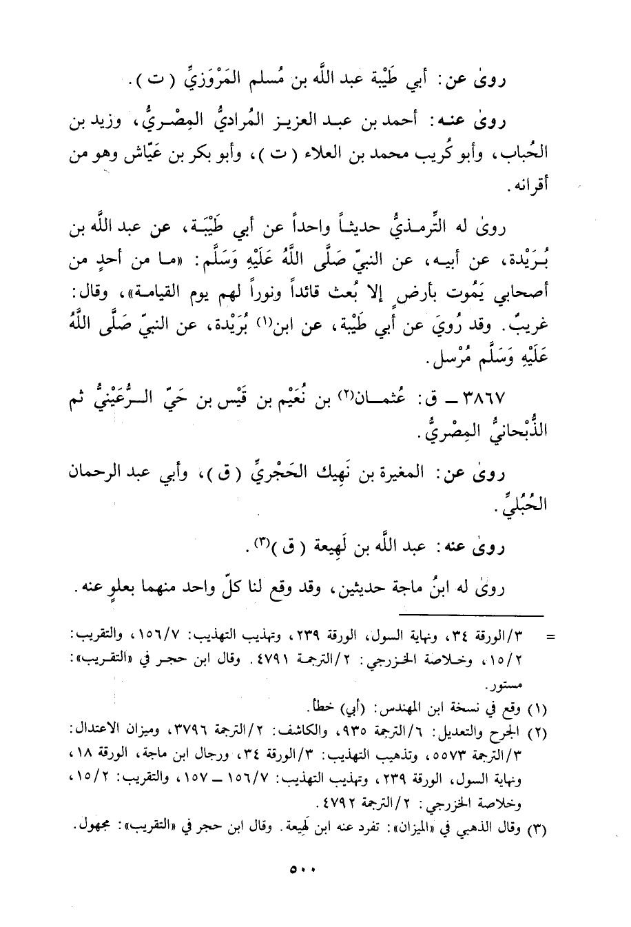 = 3 / الورقة 34، ونهاية السول، الورقة 239، وتهذيب التهذيب: 7 / 156، والتقريب: 2 / 15، وخلاصة الخزرجي: 2 / الترجمة 4791. وَقَال ابن حجر في "التقريب": مستور.