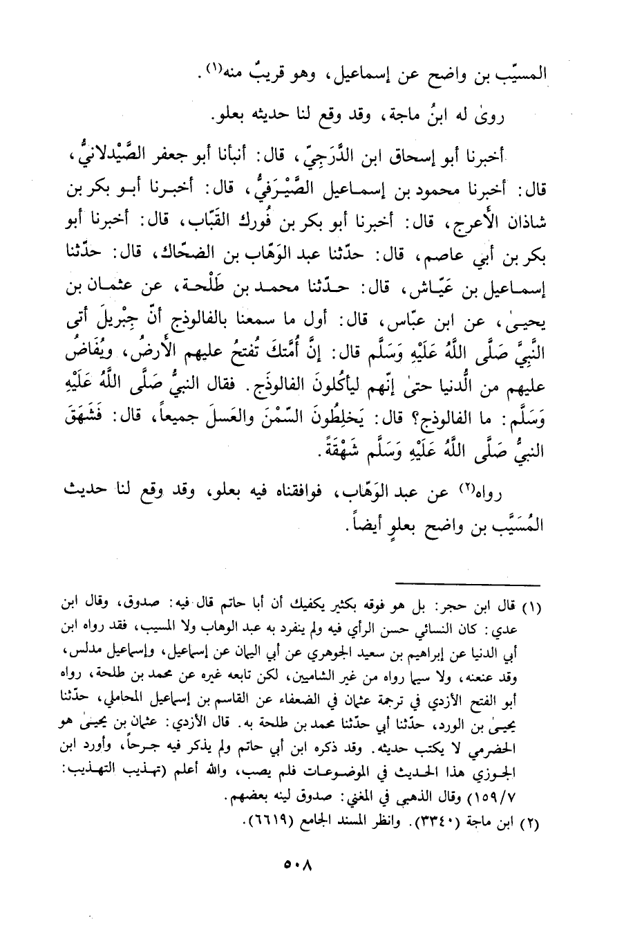 أَخْبَرَنَا أَبُو إِسْحَاقَ ابْنُ الدَّرَجِيِّ، قال: أنبأنا أَبُو جَعْفَرٍ الصَّيْدَلانِيُّ، قال: أَخْبَرَنَا مَحْمُودُ بْنُ إِسماعيل الصَّيْرَفِيُّ، قال: أَخْبَرَنَا أَبُو بَكْرِ بْنُ شَاذَانَ الأَعْرَجُ، قال: أَخْبَرَنَا أَبُو بَكْرِ بْنُ فُوُرَكَ الْقَبَّابُ، قال: أَخْبَرَنَا أبو بكر بْن أَبي عَاصِمٍ، قال: حَدَّثَنَا عَبْدُ الْوَهَّابِ بْنُ الضَّحَّاكِ، قال: حَدَّثَنَا إِسماعيل بْنُ عَيَّاشٍ، قال: حَدَّثَنَا مُحَمَّدُ بْنُ طَلْحَةَ، عَنْ عُثْمَانَ بْنِ يَحْيَى، عَنِ ابْنِ عَبَّاسٍ، قال: أَوَّلُ مَا سَمِعْنَا بِالْفَالُوذَجِ إِنَّ جِبْرِيلَ أَتَى النَّبِيَّ صَلَّى اللَّهُ عَلَيْهِ وسَلَّمَ قال: إن أُمَّتَكَ تُفْتَحُ عَلَيْهِمُ الأَرْضُ، ويُفَاضُ عَلَيْهِمُ مِنَ الدُّنْيَا حَتَّى إِنَّهُمْ لَيَأْكُلُونَ الْفَالُوذَجَ. فَقَالَ النَّبِيُّ صلى الله عليه وسلم: مَا الْفَالُوذَجُ؟ قال: يَخْلِطُونَ السَّمْنَ والْعَسَلَ جَمِيعًا، قال: فَشَهَقَ النَّبِيُّ صلى الله عليه وسلم شَهْقَةً.