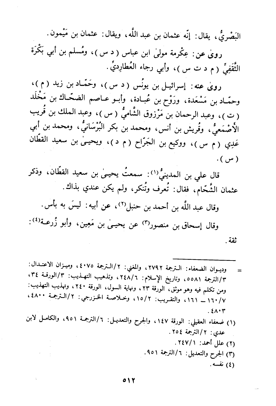 = وديوان الضعفاء: الترجمة 2792، والمغني: 2 / الترجمة 4075، وميزان الاعتدال: 3 / الترجمة 5581، وتاريخ الاسلام: 6 / 248، وتذهيب التهذيب: 3 ظ الورقة 34، ومن تكلم فيه وهو موثق، الورقة 23، ونهاية السول، الورقة 240، وتهذيب التهذيب: 7 / 160 - 161، والتقريب: 2 / 15، وخلاصة الخزرجي: 2 / الترجمة 4800، 4803.