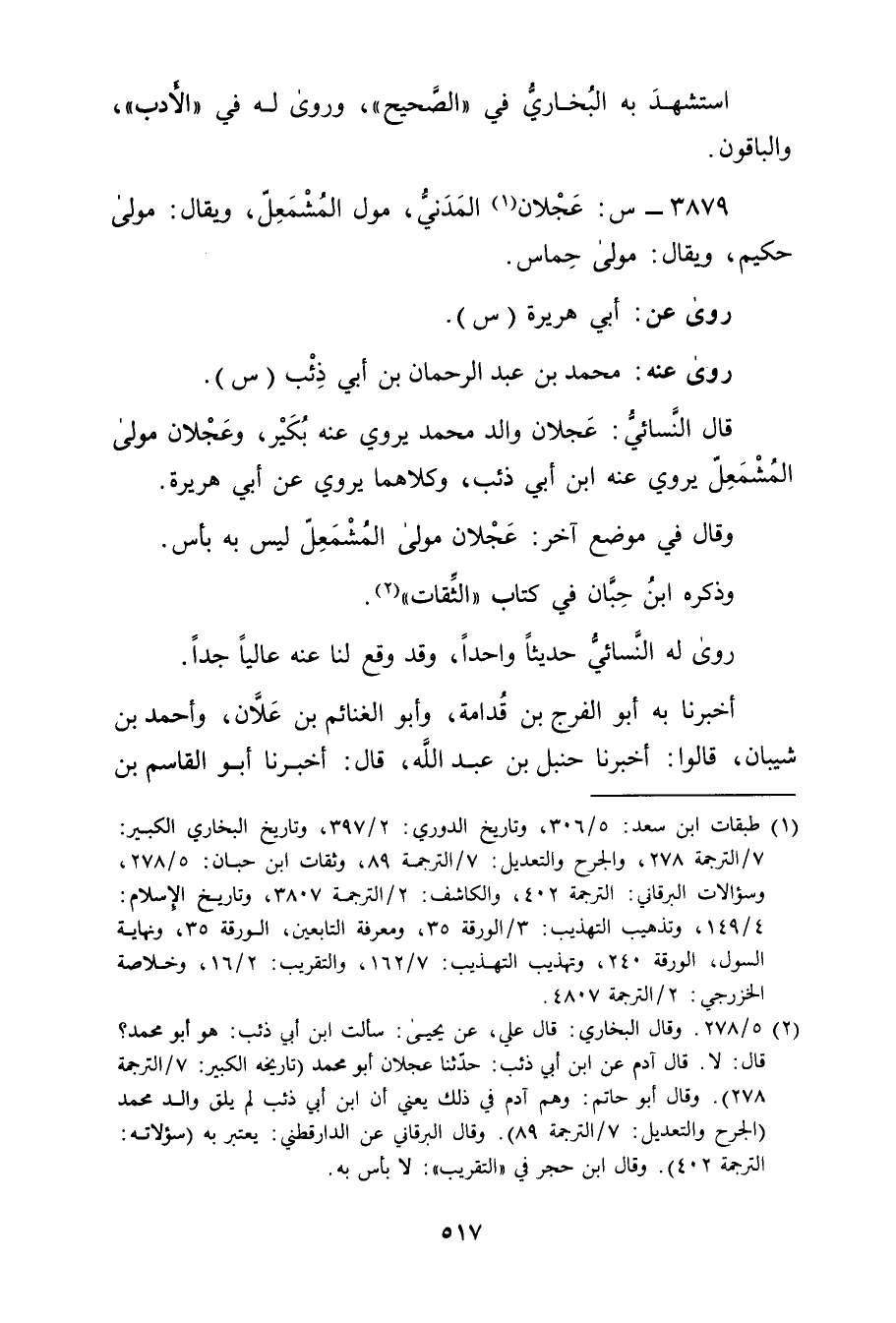 3879 - س: عجلان المدني (1) ، مول المشمعل، ويُقال: مولى حَكِيم، ويُقال: مولى حماس.