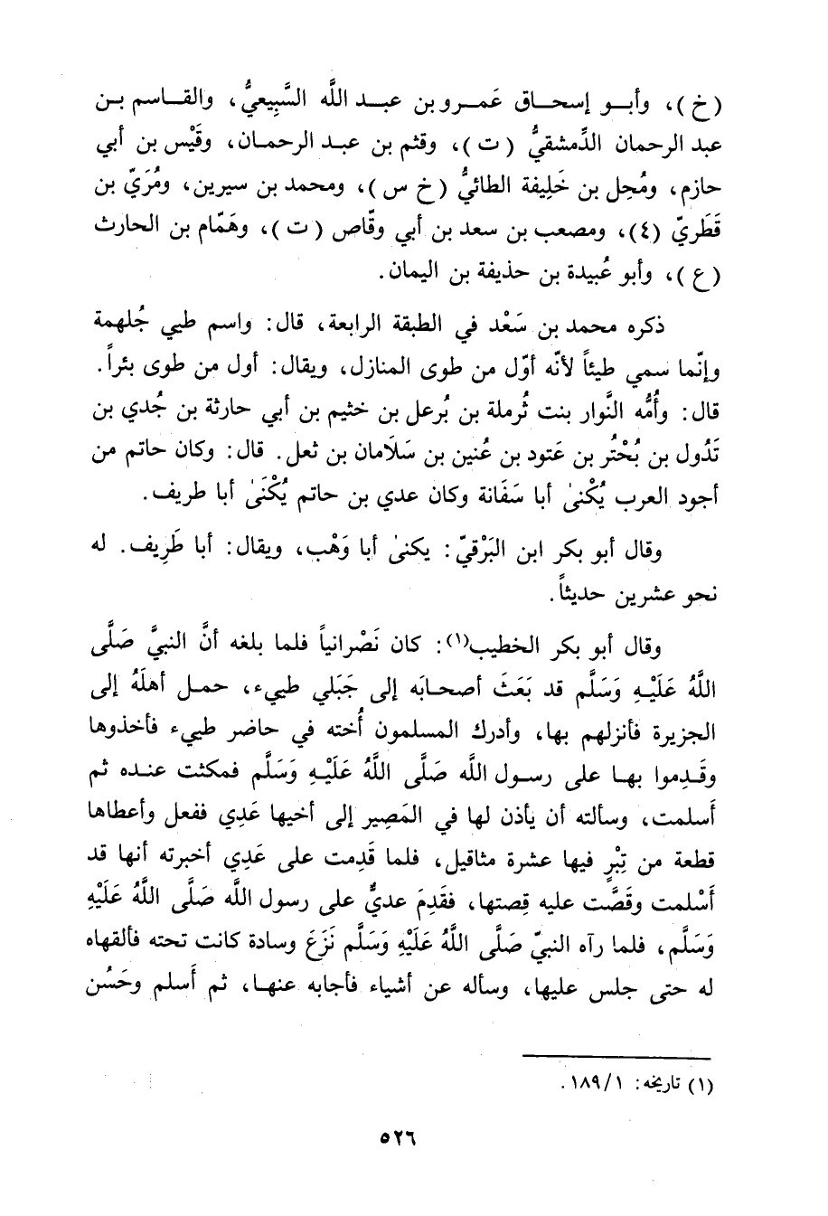 وَقَال أَبُو بَكْر الخطيب (1) : كَانَ نصرانيا فلما بلغه أَن النَّبِي صلى الله عليه وسلم قَدْ بعث أَصْحَابه إِلَى جبلي طيئ، حمل أهله إِلَى الجزيرة فأنزلهم بِهَا، وأدرك المسلمون أخته فِي حاضر طيئ فأخذوها وقدموا بِهَا عَلَى رَسُول اللَّهِ صلى الله عليه وسلم فمكثت عنده ثُمَّ أسلمت، وسألته أَن يأذن لَهَا فِي المصير إِلَى أخيها عدي ففعل وأعطاها قطعة من تبر فِيهَا عشرة مثاقيل، فلما قدمت عَلَى عدي أخبرته أَنَّهَا قَدْ أسلمت وقصت عَلَيْهِ قصتها، فقدم عدي عَلَى رَسُول اللَّهِ صلى الله عليه وسلم، فلما رآه النَّبِي صلى الله عليه وسلم نزع وسادة كانت تحته فألقهاه لَهُ حَتَّى جلس عَلَيْهَا، وسأله عَنْ أشياء فأجابه عَنْهَا، ثُمَّ أسلم وحسن