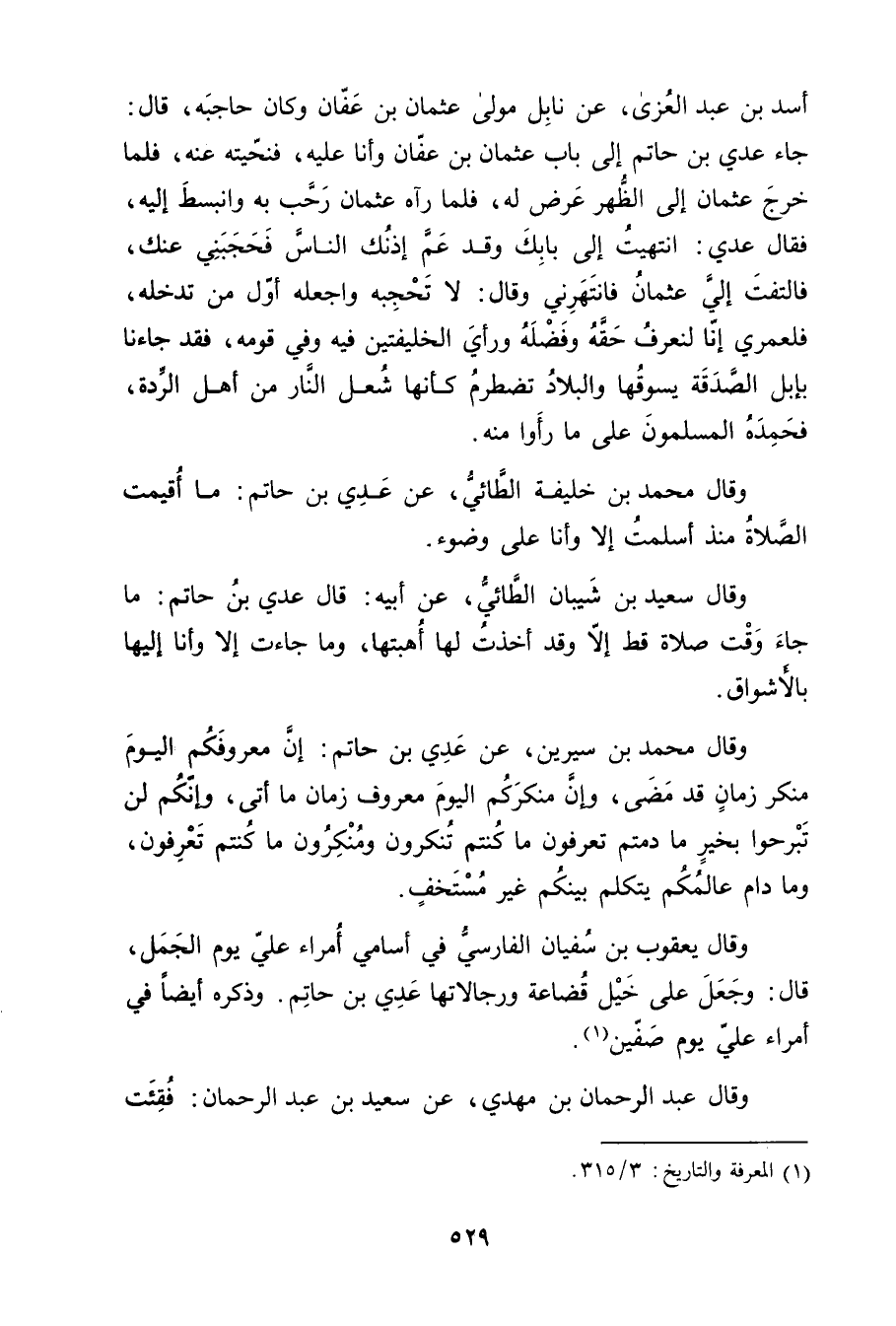 أسد بن عبد العزى، عَنْ نَابِلٍ مَوْلَى عُثْمَانَ بْنِ عَفَّانَ وكَانَ حَاجِبُهُ، قال: جَاءَ عَدِيُّ بْنُ حَاتِمٍ إِلَى بَابِ عُثْمَانَ بْنَ عَفَّانِ وأنا عَلَيْهِ، فَنَحَّيْتُهُ عَنْهُ، فَلَمَّا خَرَجَ عُثْمَانُ إِلَى الظُّهْرِ عَرْضَ لَهُ، فَلَمَّا رَآهُ عُثْمَانُ رَحَّبَ بِهِ وانْبَسَطَ إِلَيْهِ، فَقَالَ عَدِيٌّ: انْتَهَيْتُ إِلَى بَابِكَ وقَدْ عَمَّ آذِنُكَ النَّاسَ فَحَجَبَنِي عَنْكَ، فَالْتَفَتَ إِلَيَّ عُثْمَانُ فَانْتَهَرَنِي وَقَال: لا تَحْجِبْهُ واجْعَلْهُ أَوَّلَ مَنْ تُدْخِلُهُ، فلعُمَري إِنَّا لَنَعْرِفُ حَقَّهُ وفَضْلَهُ ورَأَيُ الْخَلِيفَتَيْنِ فِيهِ وفِي قَوْمِهِ، فَقَدْ جَاءَنَا بِإِبِلِ الصَّدَقَةِ يَسُوقُهَا والْبِلادُ تَضْطَرِمُ كَأَنَّهَا شُعْلُ النَّارِ مِنْ أَهْلِ الردة، فحمده المسلموم عَلَى مَا رَأَوُا مِنْهُ.