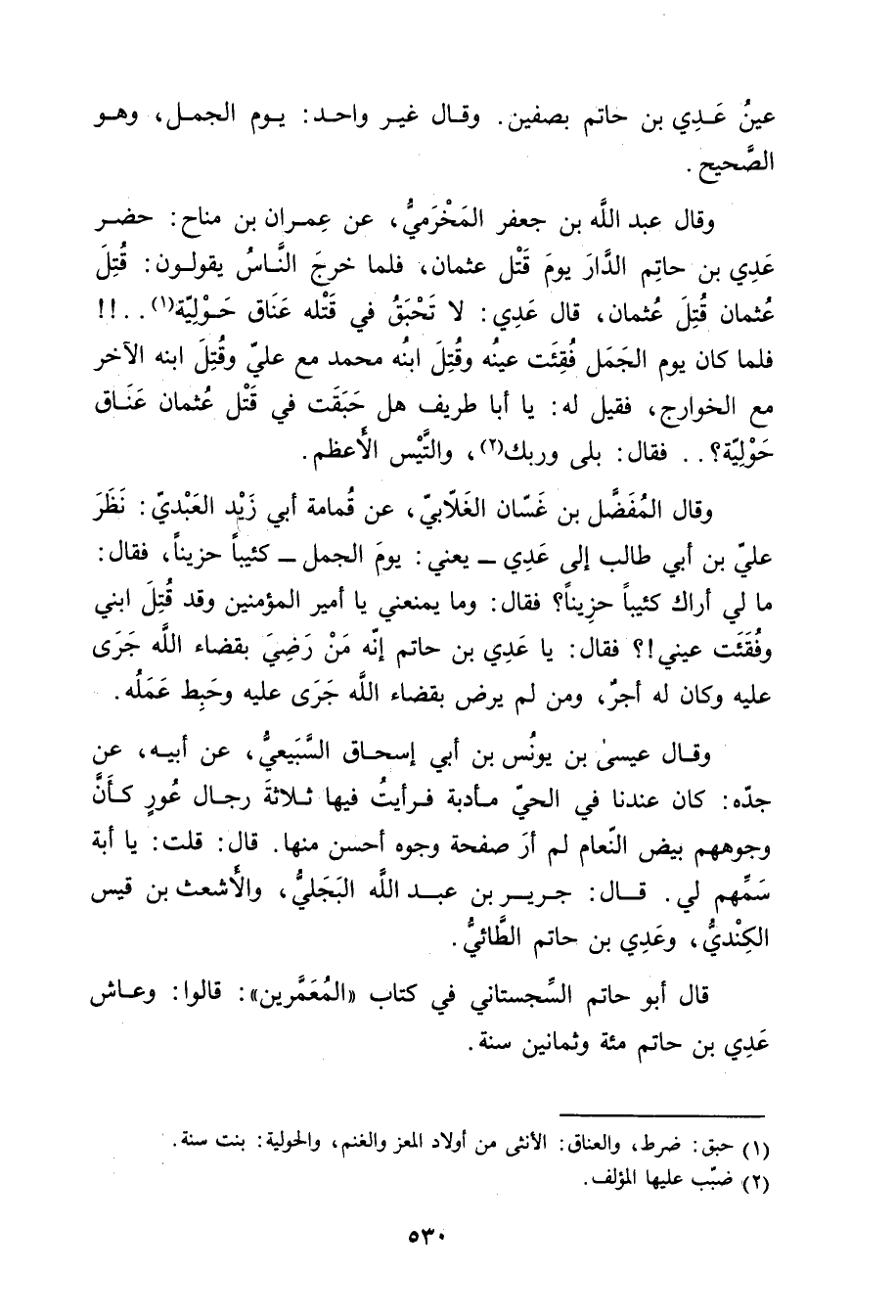 وَقَال عَبد اللَّهِ بْن جَعْفَر المخرمي، عَنْ عِمْران بْن مناح: حضر عدي بْن حاتم الدار يَوْم قتل عُثْمَان، فلما خرج النَّاس يقولون: قتل عُثْمَان قتل عُثْمَان، قال عدي: لا تحبق فِي قتله عناق حولية (1) ..! ! فلما كَانَ يَوْم الجمل فقئت عينه وقتل ابنه مُحَمَّد مَعَ عَلِي وقتل ابنه الآخر مَعَ الخوارج، فقيل لَهُ: يا أبا طريف هل حبقت فِي قتل عُثْمَان عناق حولية؟..فَقَالَ: بلى وربك (2) ، والتيس الأعظم.