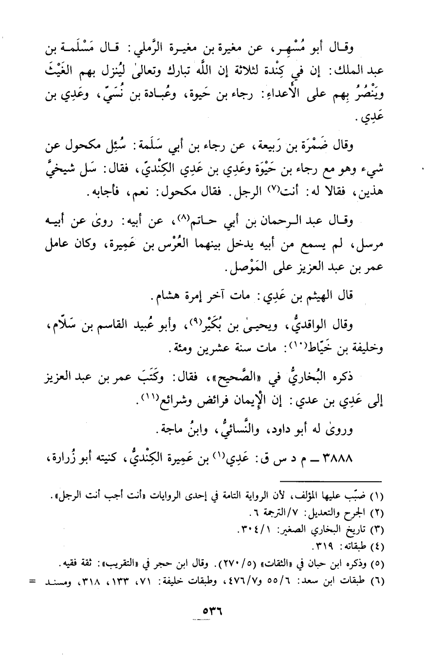 وَقَال أَبُو مسهر، عَنْ مغيرة بْن مغيرة الرملي: قال مسلمة بْن عَبد المَلِك: أن في كندة لثلاثة إِن اللَّه تبارك وتعالى لينزل بِهِم الغيث وينصر بهم على الأعداء: رجاء بْن حيوة، وعبادة بْن نسي، وعدي بْن عدي.