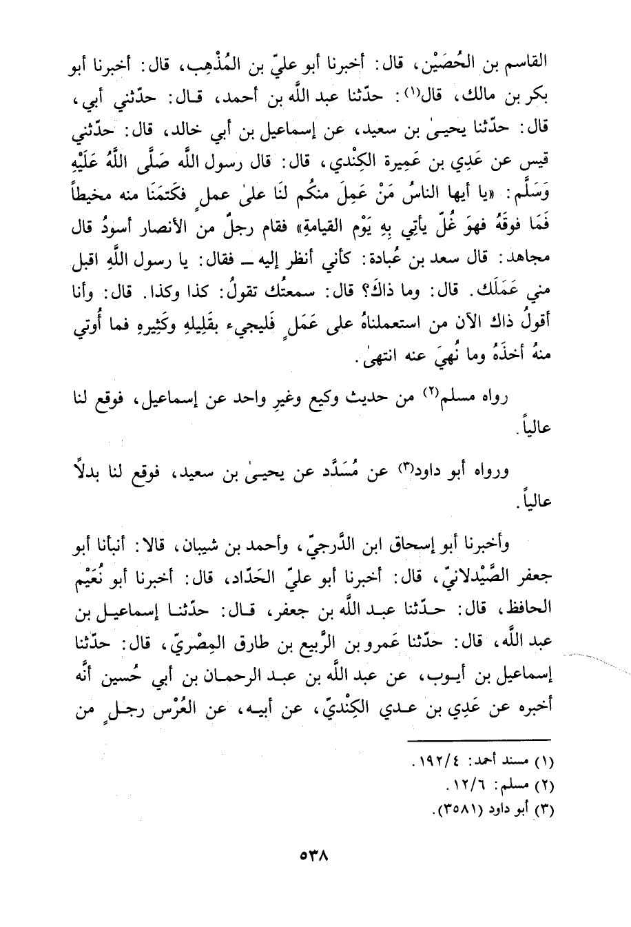القاسم بْن الحصين، قال أَخْبَرَنَا أبو علي بْن المذهب، قال: أَخْبَرَنَا أبو بكر بْن مالك، قال (1) : حَدَّثَنَا عَبد اللَّهِ بْن أَحْمَدَ، قال: حَدَّثني أبي، قال: حَدَّثَنَا يَحْيَى بْنُ سَعِيد، عن إِسماعيل بْن أَبي خالد، قال: حَدَّثَنِي قَيْسٌ عَنْ عَدِيِّ بْنِ عُمَيْرَةَ الْكَنَدِيِّ، قال: قال رَسُولُ اللَّهِ صلى الله عليه وسلم: يَا أَيُّهَا النَّاسُ مَنْ عَمِلَ مِنْكُمْ لَنَا عَلَى عَمَلٍ فَكَتَمَنَا مِنْهُ مَخِيطًا فَمَا فَوْقَهُ فَهُوَ غَلَّ يَأْتِي بِهِ يَوْمَ الْقِيَامَةِ"فَقَامَ رَجُلٌ مِنَ الأَنْصَارِ أَسْوَدُ قال مُجَاهِدٍ: قال سَعْدُ بْنُ عُبَادَةَ: كَأَنِّي أَنْظُرُ إِلَيْهِ - فَقَالَ: يَا رَسُولَ اللَّهِ اقْبَلْ مِنِّي عَمَلَكَ. قال: ومَا ذَاكَ؟ قال: سَمِعْتُكَ تَقُولُ: كَذَا وكَذَا. قال: وأَنَا أَقُولُ ذَاكَ الآنَ مَنِ اسْتَعْمَلْنَاهُ عَلَى عَمَلٍ فَلْيَجِئْ بِقَلِيلِهِ وكَثِيرِهِ فَمَا أُوتِيَ مِنْهُ أَخَذَهُ وما نهى عَنْهُ انْتَهَى.