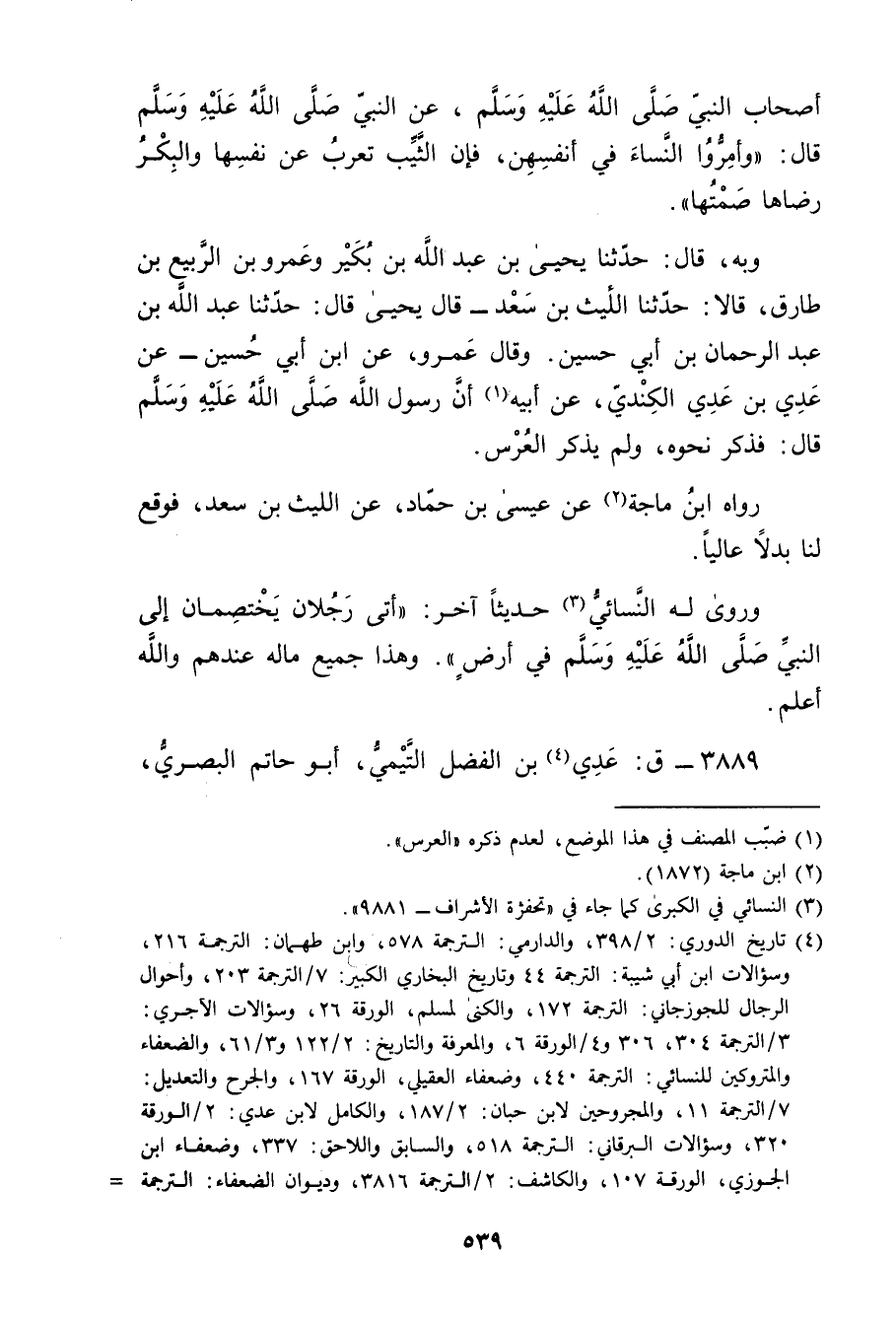 وبِهِ، قال: حَدَّثَنَا يَحْيَى بْن عَبد اللَّهِ بْن بُكَيْر وعَمْرو بْن الربيع بْن طارق، قَالا: حَدَّثَنَا اللَّيْثُ بْنُ سَعْدٍ، قال يَحْيَى قال: حَدَّثَنَا عَبد الله بْن عَبْد الرحمن بْن أَبي حسين. وَقَال عَمْرو، عَنِ ابْن أَبي حسين، عَن عدي بْنِ عَدِيِّ الْكِنْدِيِّ، عَن أَبِيهِ (1) أن رَسُول اللَّهِ صَلَّى اللَّهُ عليه وسلم قال: فذكر نحوه، ولَمْ يذكر العرس.