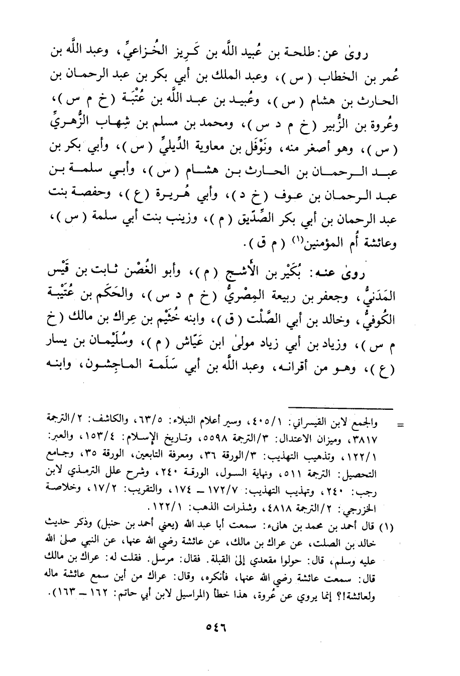 (1) قال أحمد بْن مُحَمَّد بْن هانئ: سمعت أَبَا عَبد اللَّهِ (يعني أحمد بن حنبل) وذكر حديث خالد بن الصلت، عَنْ عِرَاكِ بْنِ مَالِكٍ، عَنْ عائشة رضي الله عنها، عَنِ النَّبِيِّ صلى الله عليه وسلم، قال: حولوا مقعدي إلى القبلة. فقال: مرسل. فقلت له: عراك بن مالك قال: سمعت عائشة رضي الله عنها، فأنكره، وَقَال: عراك من أين سمع عائشة ماله ولعائشة! ؟ إنما يروي عن عروة، هذا خطأ (المراسيل لابن أَبي حاتم: 162 - 163) .