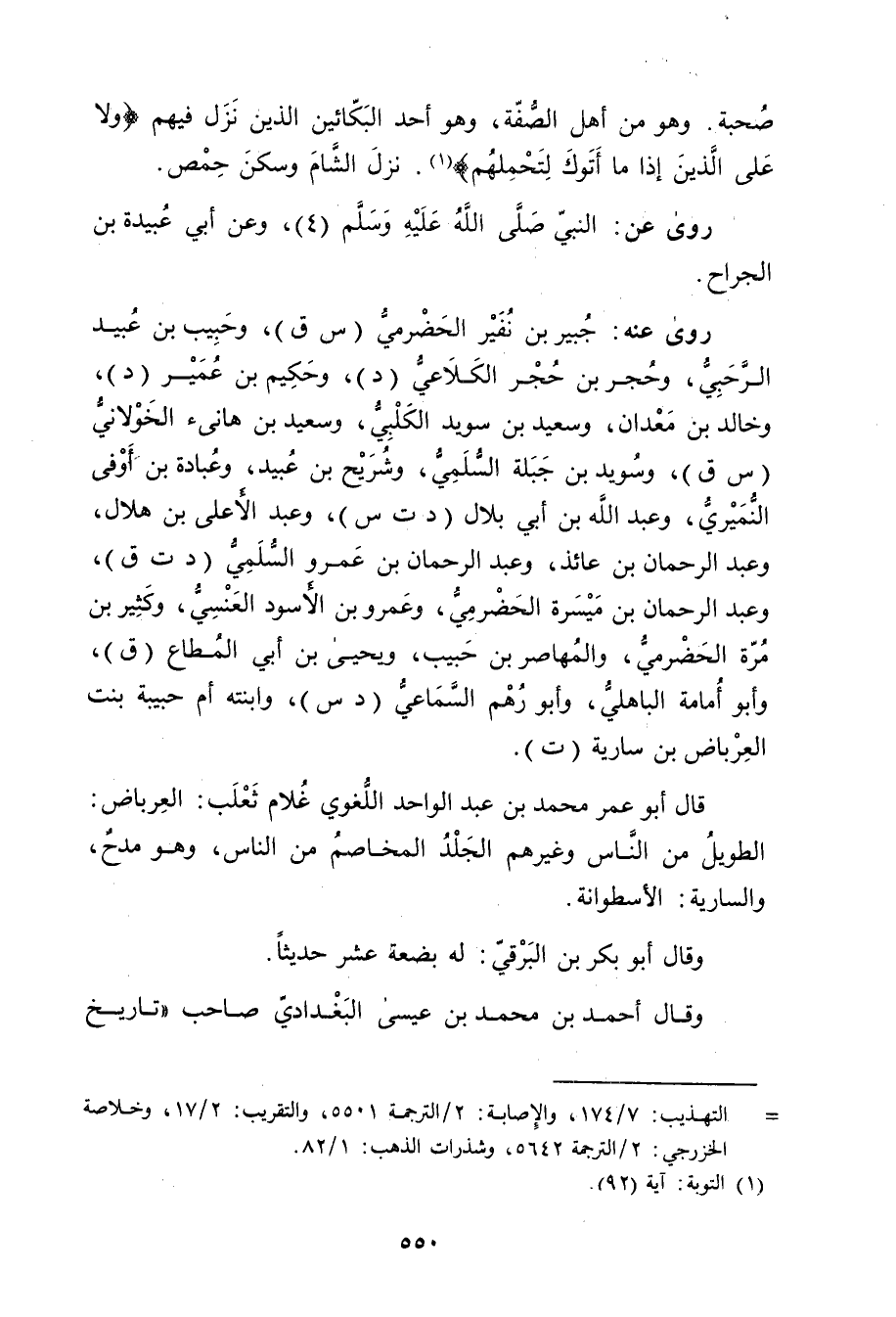 صحبة. وهُوَ من أَهل الصفة، وهو أحد البكائين الذين نزل فيهم (وَلا عَلَى الَّذِينَ إِذَا مَا أتوك لتحملهم) (1) . نزل الشام وسكن حمص.