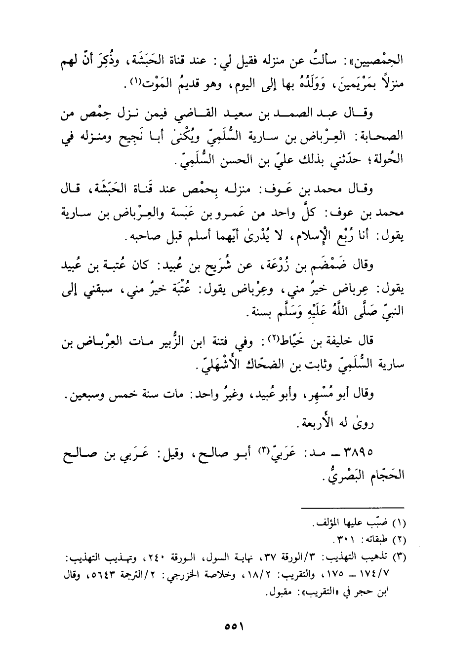 وَقَال عَبْد الصمد بْن سَعِيد القاضي فيمن نزل حمص من الصَّحَابَة: العرباض بْن سارية السلمي ويكنى أبا نجيح ومنزله فِي الحولة، حَدَّثَنِي بِذَلِكَ عَلِي بْن الْحَسَن السلمي.